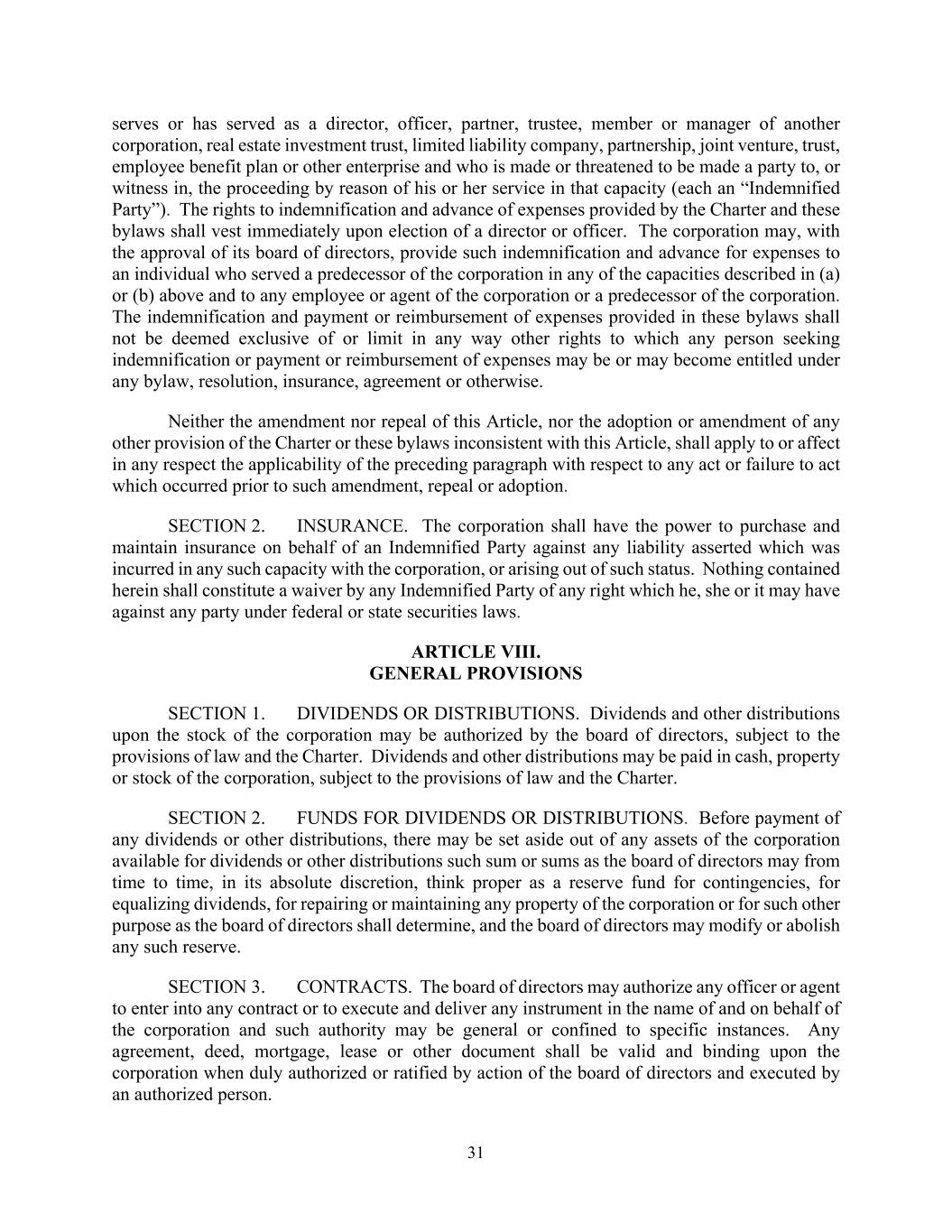 31 serves or has served as a director, officer, partner, trustee, member or manager of another corporation, real estate investment trust, limited liability company, partnership, joint venture, trust, employee benefit plan or other enterprise and who is made or threatened to be made a party to, or witness in, the proceeding by reason of his or her service in that capacity (each an “Indemnified Party”). The rights to indemnification and advance of expenses provided by the Charter and these bylaws shall vest immediately upon election of a director or officer. The corporation may, with the approval of its board of directors, provide such indemnification and advance for expenses to an individual who served a predecessor of the corporation in any of the capacities described in (a) or (b) above and to any employee or agent of the corporation or a predecessor of the corporation. The indemnification and payment or reimbursement of expenses provided in these bylaws shall not be deemed exclusive of or limit in any way other rights to which any person seeking indemnification or payment or reimbursement of expenses may be or may become entitled under any bylaw, resolution, insurance, agreement or otherwise. Neither the amendment nor repeal of this Article, nor the adoption or amendment of any other provision of the Charter or these bylaws inconsistent with this Article, shall apply to or affect in any respect the applicability of the preceding paragraph with respect to any act or failure to act which occurred prior to such amendment, repeal or adoption. SECTION 2. INSURANCE. The corporation shall have the power to purchase and maintain insurance on behalf of an Indemnified Party against any liability asserted which was incurred in any such capacity with the corporation, or arising out of such status. Nothing contained herein shall constitute a waiver by any Indemnified Party of any right which he, she or it may have against any party under federal or state securities laws. ARTICLE VIII. GENERAL PROVISIONS SECTION 1. DIVIDENDS OR DISTRIBUTIONS. Dividends and other distributions upon the stock of the corporation may be authorized by the board of directors, subject to the provisions of law and the Charter. Dividends and other distributions may be paid in cash, property or stock of the corporation, subject to the provisions of law and the Charter. SECTION 2. FUNDS FOR DIVIDENDS OR DISTRIBUTIONS. Before payment of any dividends or other distributions, there may be set aside out of any assets of the corporation available for dividends or other distributions such sum or sums as the board of directors may from time to time, in its absolute discretion, think proper as a reserve fund for contingencies, for equalizing dividends, for repairing or maintaining any property of the corporation or for such other purpose as the board of directors shall determine, and the board of directors may modify or abolish any such reserve. SECTION 3. CONTRACTS. The board of directors may authorize any officer or agent to enter into any contract or to execute and deliver any instrument in the name of and on behalf of the corporation and such authority may be general or confined to specific instances. Any agreement, deed, mortgage, lease or other document shall be valid and binding upon the corporation when duly authorized or ratified by action of the board of directors and executed by an authorized person.