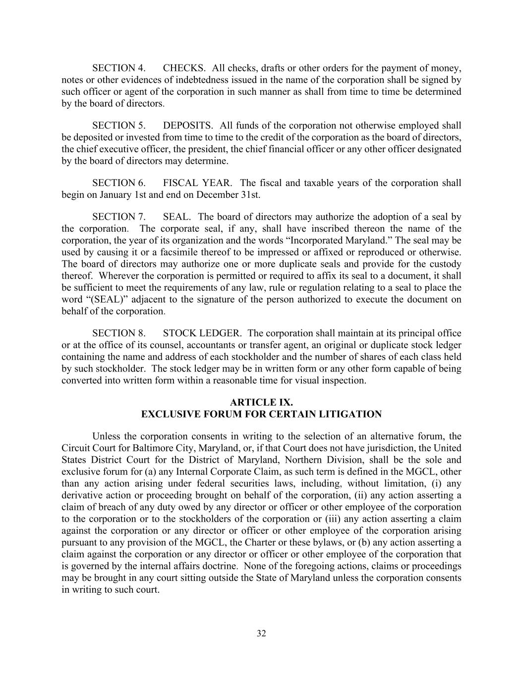 32 SECTION 4. CHECKS. All checks, drafts or other orders for the payment of money, notes or other evidences of indebtedness issued in the name of the corporation shall be signed by such officer or agent of the corporation in such manner as shall from time to time be determined by the board of directors. SECTION 5. DEPOSITS. All funds of the corporation not otherwise employed shall be deposited or invested from time to time to the credit of the corporation as the board of directors, the chief executive officer, the president, the chief financial officer or any other officer designated by the board of directors may determine. SECTION 6. FISCAL YEAR. The fiscal and taxable years of the corporation shall begin on January 1st and end on December 31st. SECTION 7. SEAL. The board of directors may authorize the adoption of a seal by the corporation. The corporate seal, if any, shall have inscribed thereon the name of the corporation, the year of its organization and the words “Incorporated Maryland.” The seal may be used by causing it or a facsimile thereof to be impressed or affixed or reproduced or otherwise. The board of directors may authorize one or more duplicate seals and provide for the custody thereof. Wherever the corporation is permitted or required to affix its seal to a document, it shall be sufficient to meet the requirements of any law, rule or regulation relating to a seal to place the word “(SEAL)” adjacent to the signature of the person authorized to execute the document on behalf of the corporation. SECTION 8. STOCK LEDGER. The corporation shall maintain at its principal office or at the office of its counsel, accountants or transfer agent, an original or duplicate stock ledger containing the name and address of each stockholder and the number of shares of each class held by such stockholder. The stock ledger may be in written form or any other form capable of being converted into written form within a reasonable time for visual inspection. ARTICLE IX. EXCLUSIVE FORUM FOR CERTAIN LITIGATION Unless the corporation consents in writing to the selection of an alternative forum, the Circuit Court for Baltimore City, Maryland, or, if that Court does not have jurisdiction, the United States District Court for the District of Maryland, Northern Division, shall be the sole and exclusive forum for (a) any Internal Corporate Claim, as such term is defined in the MGCL, other than any action arising under federal securities laws, including, without limitation, (i) any derivative action or proceeding brought on behalf of the corporation, (ii) any action asserting a claim of breach of any duty owed by any director or officer or other employee of the corporation to the corporation or to the stockholders of the corporation or (iii) any action asserting a claim against the corporation or any director or officer or other employee of the corporation arising pursuant to any provision of the MGCL, the Charter or these bylaws, or (b) any action asserting a claim against the corporation or any director or officer or other employee of the corporation that is governed by the internal affairs doctrine. None of the foregoing actions, claims or proceedings may be brought in any court sitting outside the State of Maryland unless the corporation consents in writing to such court.