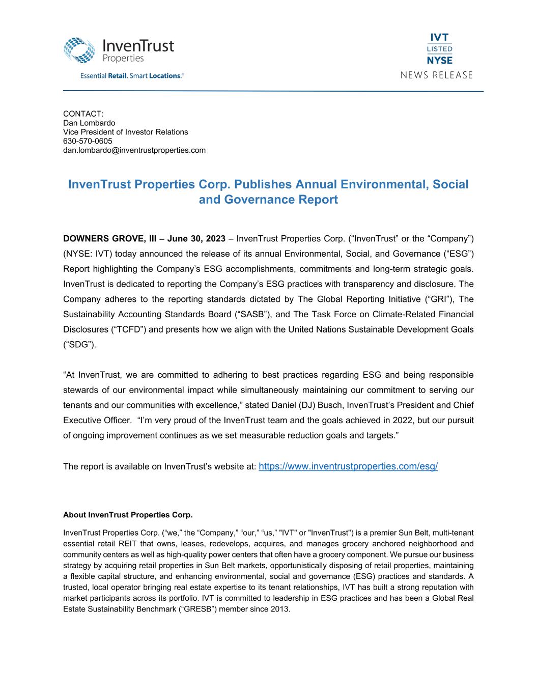 NEWS RELEASE   CONTACT: Dan Lombardo Vice President of Investor Relations 630-570-0605 dan.lombardo@inventrustproperties.com InvenTrust Properties Corp. Publishes Annual Environmental, Social and Governance Report DOWNERS GROVE, III – June 30, 2023 – InvenTrust Properties Corp. (“InvenTrust” or the “Company”) (NYSE: IVT) today announced the release of its annual Environmental, Social, and Governance (“ESG”) Report highlighting the Company’s ESG accomplishments, commitments and long-term strategic goals. InvenTrust is dedicated to reporting the Company’s ESG practices with transparency and disclosure. The Company adheres to the reporting standards dictated by The Global Reporting Initiative (“GRI”), The Sustainability Accounting Standards Board (“SASB”), and The Task Force on Climate-Related Financial Disclosures (“TCFD”) and presents how we align with the United Nations Sustainable Development Goals (“SDG”). “At InvenTrust, we are committed to adhering to best practices regarding ESG and being responsible stewards of our environmental impact while simultaneously maintaining our commitment to serving our tenants and our communities with excellence,” stated Daniel (DJ) Busch, InvenTrust’s President and Chief Executive Officer. “I’m very proud of the InvenTrust team and the goals achieved in 2022, but our pursuit of ongoing improvement continues as we set measurable reduction goals and targets.” The report is available on InvenTrust’s website at: https://www.inventrustproperties.com/esg/  About InvenTrust Properties Corp. InvenTrust Properties Corp. (“we,” the “Company,” “our,” “us,” "IVT" or "InvenTrust") is a premier Sun Belt, multi-tenant essential retail REIT that owns, leases, redevelops, acquires, and manages grocery anchored neighborhood and community centers as well as high-quality power centers that often have a grocery component. We pursue our business strategy by acquiring retail properties in Sun Belt markets, opportunistically disposing of retail properties, maintaining a flexible capital structure, and enhancing environmental, social and governance (ESG) practices and standards. A trusted, local operator bringing real estate expertise to its tenant relationships, IVT has built a strong reputation with market participants across its portfolio. IVT is committed to leadership in ESG practices and has been a Global Real Estate Sustainability Benchmark (“GRESB”) member since 2013.