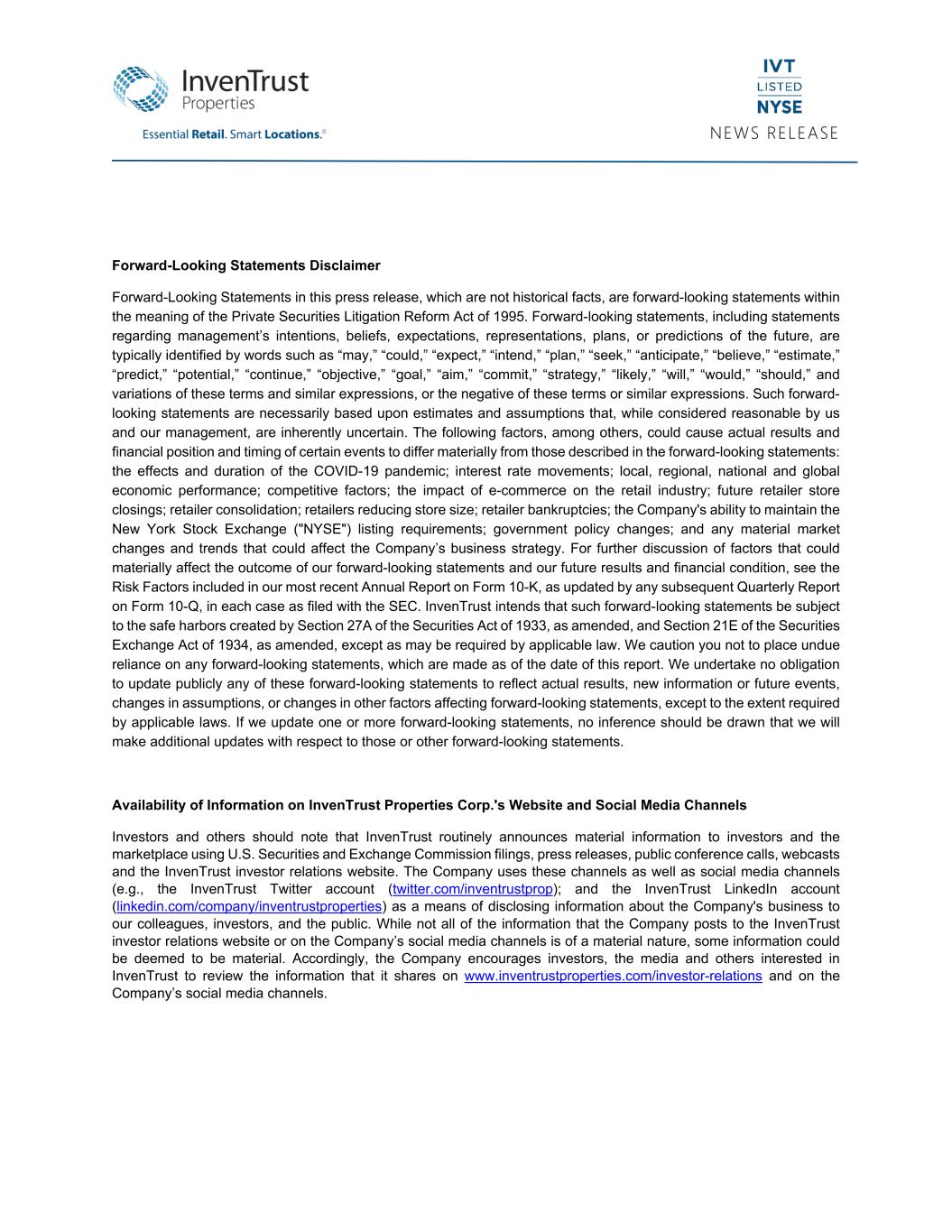 NEWS RELEASE   Forward-Looking Statements Disclaimer Forward-Looking Statements in this press release, which are not historical facts, are forward-looking statements within the meaning of the Private Securities Litigation Reform Act of 1995. Forward-looking statements, including statements regarding management’s intentions, beliefs, expectations, representations, plans, or predictions of the future, are typically identified by words such as “may,” “could,” “expect,” “intend,” “plan,” “seek,” “anticipate,” “believe,” “estimate,” “predict,” “potential,” “continue,” “objective,” “goal,” “aim,” “commit,” “strategy,” “likely,” “will,” “would,” “should,” and variations of these terms and similar expressions, or the negative of these terms or similar expressions. Such forward- looking statements are necessarily based upon estimates and assumptions that, while considered reasonable by us and our management, are inherently uncertain. The following factors, among others, could cause actual results and financial position and timing of certain events to differ materially from those described in the forward-looking statements: the effects and duration of the COVID-19 pandemic; interest rate movements; local, regional, national and global economic performance; competitive factors; the impact of e-commerce on the retail industry; future retailer store closings; retailer consolidation; retailers reducing store size; retailer bankruptcies; the Company's ability to maintain the New York Stock Exchange ("NYSE") listing requirements; government policy changes; and any material market changes and trends that could affect the Company’s business strategy. For further discussion of factors that could materially affect the outcome of our forward-looking statements and our future results and financial condition, see the Risk Factors included in our most recent Annual Report on Form 10-K, as updated by any subsequent Quarterly Report on Form 10-Q, in each case as filed with the SEC. InvenTrust intends that such forward-looking statements be subject to the safe harbors created by Section 27A of the Securities Act of 1933, as amended, and Section 21E of the Securities Exchange Act of 1934, as amended, except as may be required by applicable law. We caution you not to place undue reliance on any forward-looking statements, which are made as of the date of this report. We undertake no obligation to update publicly any of these forward-looking statements to reflect actual results, new information or future events, changes in assumptions, or changes in other factors affecting forward-looking statements, except to the extent required by applicable laws. If we update one or more forward-looking statements, no inference should be drawn that we will make additional updates with respect to those or other forward-looking statements. Availability of Information on InvenTrust Properties Corp.'s Website and Social Media Channels Investors and others should note that InvenTrust routinely announces material information to investors and the marketplace using U.S. Securities and Exchange Commission filings, press releases, public conference calls, webcasts and the InvenTrust investor relations website. The Company uses these channels as well as social media channels (e.g., the InvenTrust Twitter account (twitter.com/inventrustprop); and the InvenTrust LinkedIn account (linkedin.com/company/inventrustproperties) as a means of disclosing information about the Company's business to our colleagues, investors, and the public. While not all of the information that the Company posts to the InvenTrust investor relations website or on the Company’s social media channels is of a material nature, some information could be deemed to be material. Accordingly, the Company encourages investors, the media and others interested in InvenTrust to review the information that it shares on www.inventrustproperties.com/investor-relations and on the Company’s social media channels.