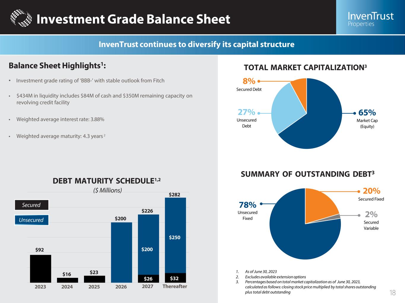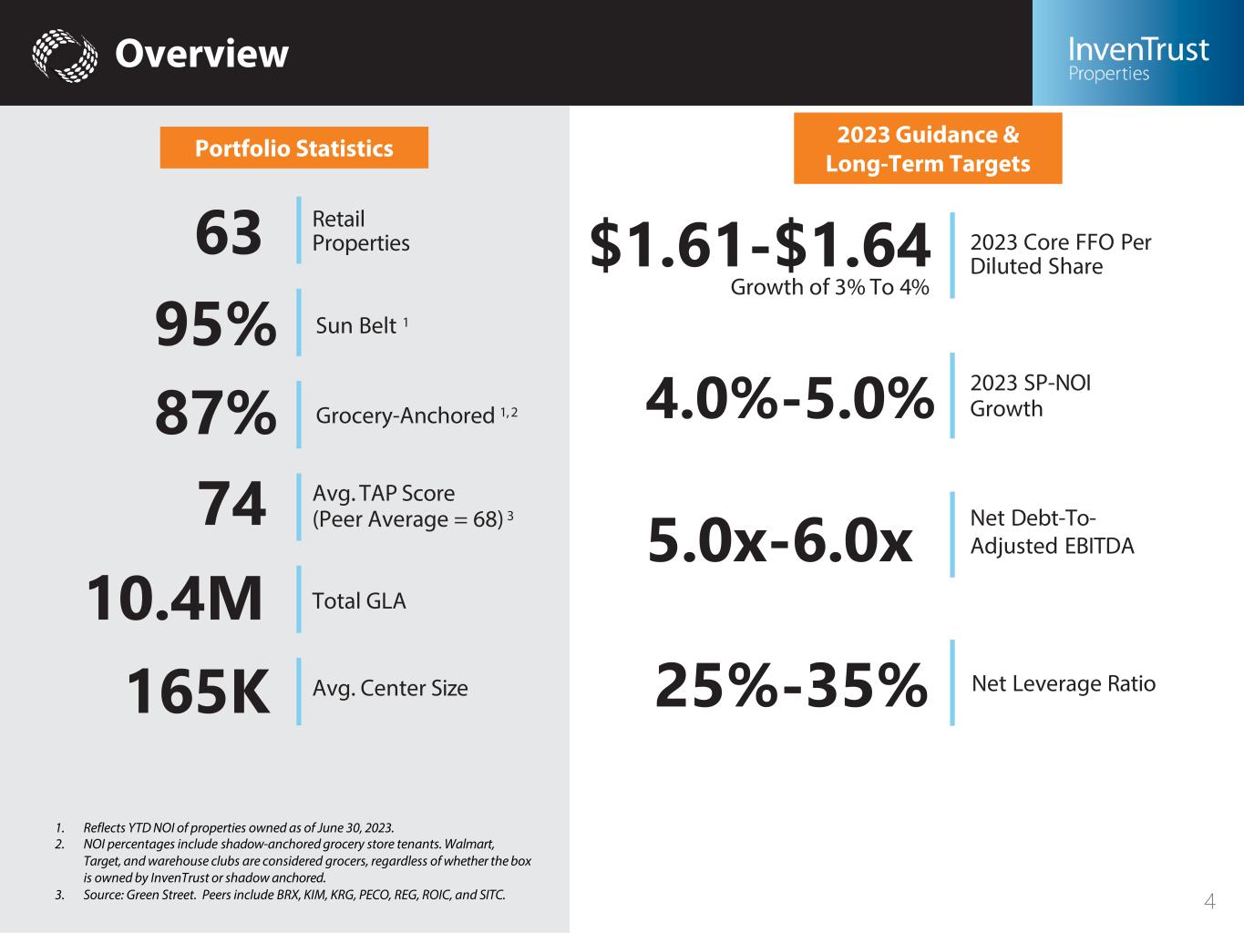 Introductory Notes Cautionary Note About Forward-Looking Statements Forward-Looking Statements in this presentation, which are not historical facts, are forward-looking statements within the meaning of the Private Securities Litigation Reform Act of 1995. Forward-looking statements, including statements about the Company’s 2023 guidance, portfolio resilience and positioning, and acquisition growth or regarding management’s intentions, beliefs, expectations, representation, plans or predictions of the future, are typically identified by words such as “may,” “could,” “expect,” “intend,” “plan,” “seek,” “anticipate,” “believe,” “estimate,” “predict,” “potential,” “continue,” “likely,” “will,” “would,” “outlook,” “guidance,” and variations of these terms and similar expressions, or the negative of these terms or similar expressions. Such forward-looking statements are necessarily based upon estimates and assumptions that, while considered reasonable by us and our management, are inherently uncertain. The following factors, among others, could cause actual results and financial position and timing of certain events to differ materially from those described in the forward-looking statements: interest rate movements; local, regional, national and global economic performance; the impact of inflation on the Company and on its tenants; competitive factors; the impact of e-commerce on the retail industry; future retailer store closings; retailer consolidation; retailers reducing store size; retailer bankruptcies; government policy changes; the effects and duration of the COVID-19 pandemic; and any material market changes and trends that could affect the Company’s business strategy. For further discussion of factors that could materially affect the outcome of our forward-looking statements and our future results and financial condition, see the Risk Factors included in InvenTrust’s most recent Annual Report on Form 10-K, as updated by any subsequent Quarterly Report on Form 10-Q, in each case as filed with the Securities and Exchange Commission. InvenTrust intends that such forward-looking statements be subject to the safe harbors created by Section 27A of the Securities Act of 1933, as amended, and Section 21E of the Securities Exchange Act of 1934, as amended, except as may be required by applicable law. We caution you not to place undue reliance on any forward-looking statements, which are made as of the date of this press release. We undertake no obligation to update publicly any of these forward-looking statements to reflect actual results, new information or future events, changes in assumptions or changes in other factors affecting forward-looking statements, except to the extent required by applicable laws. If we update one or more forward-looking statements, no inference should be drawn that we will make additional updates with respect to those or other forward-looking statements. Trademarks The companies depicted in the photographs herein, or any third-party trademarks, including names, logos and brands, referenced by the Company in this presentation, are the property of their respective owners. All references to third-party trademarks are for identification purposes only and nothing herein shall be considered to be an endorsement, authorization or approval of InvenTrust Properties Corp. by the companies. Further, none of these companies are affiliated with the Company in any manner. 2