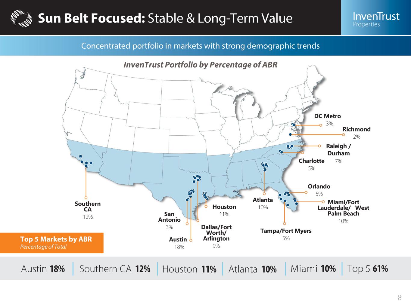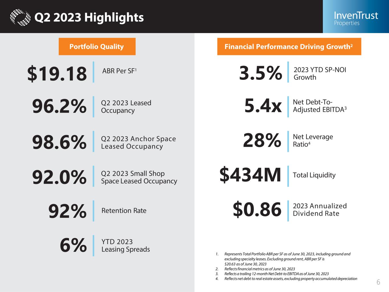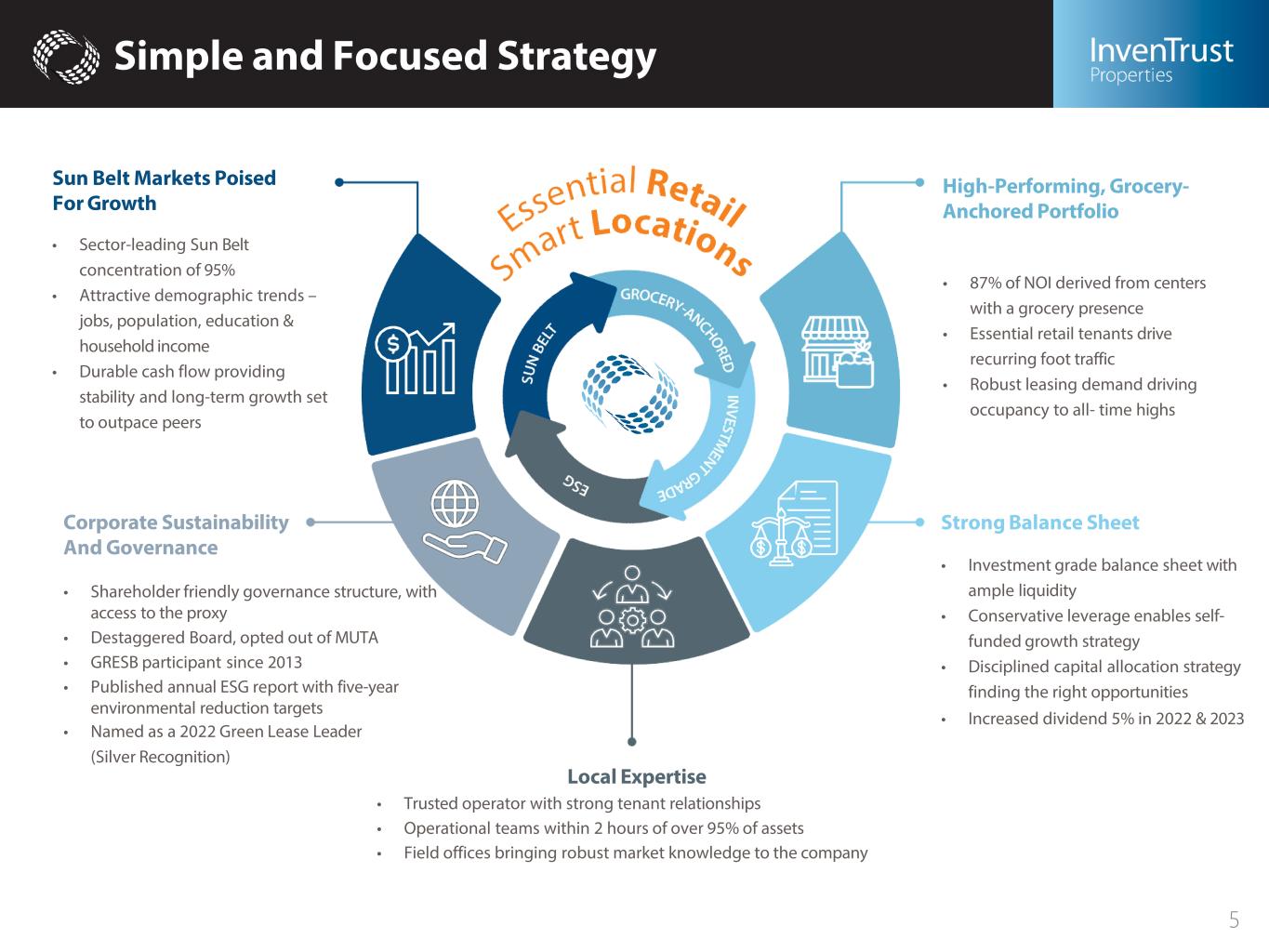 Simple and Focused Strategy High-Performing, Grocery- Anchored Portfolio • 87% of NOI derived from centers with a grocery presence • Essential retail tenants drive recurring foot traffic • Robust leasing demand driving occupancy to all- time highs Strong Balance Sheet • Investment grade balance sheet with ample liquidity • Conservative leverage enables self- funded growth strategy • Disciplined capital allocation strategy finding the right opportunities • Increased dividend 5% in 2022 & 2023 Sun Belt Markets Poised For Growth • Sector-leading Sun Belt concentration of 95% • Attractive demographic trends – jobs, population, education & household income • Durable cash flow providing stability and long-term growth set to outpace peers Corporate Sustainability And Governance • Shareholder friendly governance structure, with access to the proxy • Destaggered Board, opted out of MUTA • GRESB participant since 2013 • Published annual ESG report with five-year environmental reduction targets • Named as a 2022 Green Lease Leader (Silver Recognition) Local Expertise • Trusted operator with strong tenant relationships • Operational teams within 2 hours of over 95% of assets • Field offices bringing robust market knowledge to the company 5