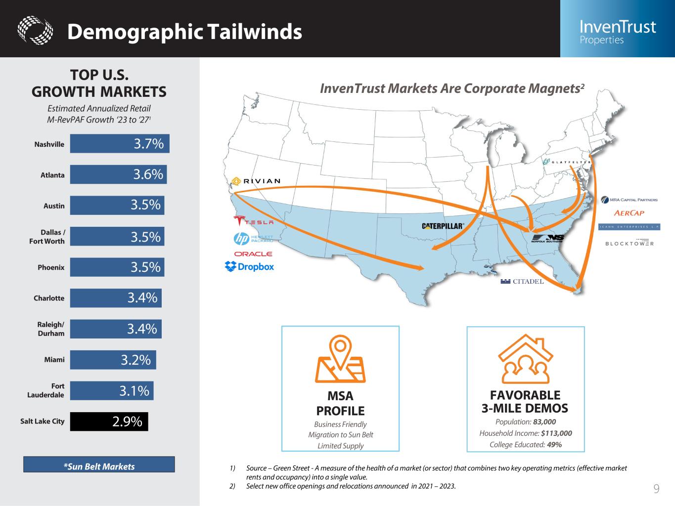 Sun Belt Focused: Stable & Long-Term Value Atlanta 10%Houston 11% Miami 10% Top 5 61% Top 5 Markets by ABR Percentage of Total Concentrated portfolio in markets with strong demographic trends InvenTrust Portfolio by Percentage of ABR Southern CA 12% San Antonio 3% Austin 18% Dallas/Fort Worth/ Arlington 9% Houston 11% Atlanta 10% Tampa/Fort Myers 5% Miami/Fort Lauderdale/ West Palm Beach 10% Orlando 5% Charlotte 5% Raleigh / Durham 7% DC Metro 3% 8 Austin 18% Southern CA 12% Richmond 2%
