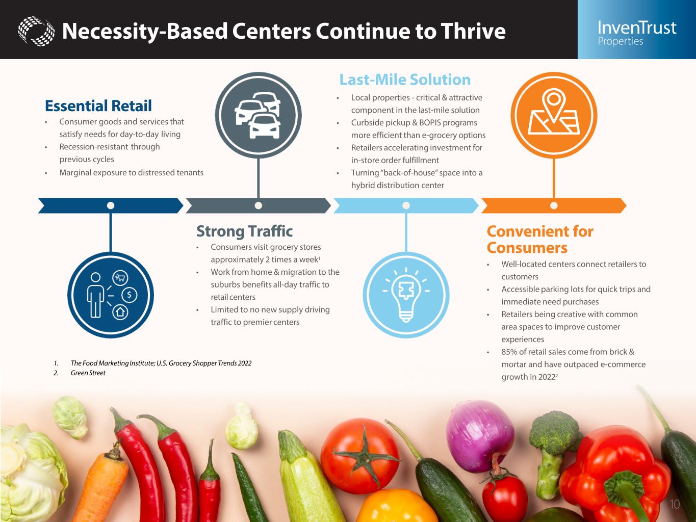 Demographic Tailwinds Nashville Atlanta Austin Dallas / Fort Worth Phoenix Charlotte Raleigh/ Durham Miami Fort Lauderdale Salt Lake City *Sun Belt Markets TOP U.S. GROWTH MARKETS Estimated Annualized Retail M-RevPAF Growth ‘23 to ‘271 InvenTrust Markets Are Corporate Magnets2 FAVORABLE 3-MILE DEMOS Population: 83,000 Household Income: $113,000 College Educated: 49% MSA PROFILE Business Friendly Migration to Sun Belt Limited Supply 9 3.7% 3.6% 3.5% 3.5% 3.5% 3.4% 3.4% 3.2% 3.1% 2.9% 1) Source – Green Street - A measure of the health of a market (or sector) that combines two key operating metrics (effective market rents and occupancy) into a single value. 2) Select new office openings and relocations announced in 2021 – 2023.