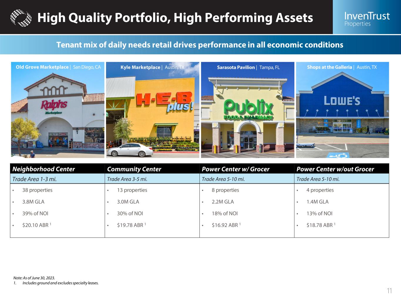 Add Page Numbers in PPT Necessity-Based Centers Continue to Thrive Essential Retail • Consumer goods and services that satisfy needs for day-to-day living • Recession-resistant through previous cycles • Marginal exposure to distressed tenants Strong Traffic • Consumers visit grocery stores approximately 2 times a week1 • Work from home & migration to the suburbs benefits all-day traffic to retail centers • Limited to no new supply driving traffic to premier centers Last-Mile Solution • Local properties - critical & attractive component in the last-mile solution • Curbside pickup & BOPIS programs more efficient than e-grocery options • Retailers accelerating investment for in-store order fulfillment • Turning “back-of-house” space into a hybrid distribution center Convenient for Consumers • Well-located centers connect retailers to customers • Accessible parking lots for quick trips and immediate need purchases • Retailers being creative with common area spaces to improve customer experiences • 85% of retail sales come from brick & mortar and have outpaced e-commerce growth in 20222 1. The Food Marketing Institute; U.S. Grocery Shopper Trends 2022 2. Green Street 10