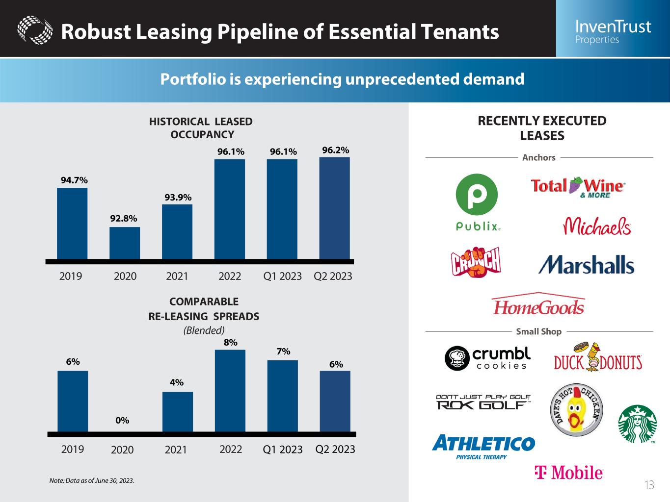 Essential Retail is Recession Resistant 7 of the top 15 tenants are grocers, which drive traffic to centers TOP 15 TENANTS # Tenant Credit Rating (S&P) # of Leases % of ABR 1 BBB 151 5.2 2 N/A 152 3.4 3 A 13 2.4 4 BB 6 2.3 5 N/A 5 2.3 6 AA 5 1.4 7 B+ 7 1.3 8 BBB+ 4 1.2 9 N/A 8 1.1 10 D 5 1.0 11 BBB 3 1.0 12 B- 6 1.0 13 A+ 2 0.9 14 N/A 4 0.9 15 A- 7 0.9 Top 15 Total 105 26.3% % OF ABR Essential Retail 60.1% Grocery / Drug 20.0 Health & Beauty Services 11.1 Medical 9.0 Off Price 5.0 Banks 4.9 Office / Communications 3.4 Pets 3.3 Other Essential Retail / Services 2.6 Hardware / Auto 0.8 Restaurants 20.2% Quick Service 11.9 Full Service 8.3 Other Retail / Services 19.7% Apparel / Accessories 5.0 Home 3.6 Fitness 3.6 Hobby / Sports 2.8 Office (Non-Financial, Non-Medical) 1.3 Entertainment 1.0 Other 2.4 Total 100%Note: as of June 30, 2023. 1. Includes one fuel pad. 2. Includes three Publix Liquor locations *Grocer Tenant 12