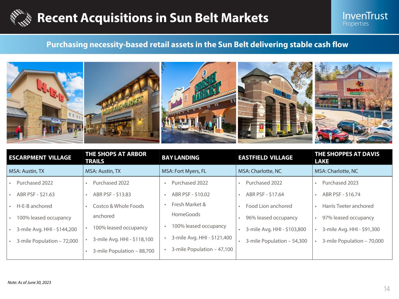 2019 2020 2021 2022 Q1 2023 Q2 2023 HISTORICAL LEASED OCCUPANCY 94.7% 92.8% 96.1% 93.9% Robust Leasing Pipeline of Essential Tenants Portfolio is experiencing unprecedented demand RECENTLY EXECUTED LEASES Note: Data as of June 30, 2023. Anchors Small Shop 13 20222019 6% 8% 0% COMPARABLE RE-LEASING SPREADS (Blended) 4% 2020 2021 96.1% 7% Q1 2023 96.2% 6% Q2 2023