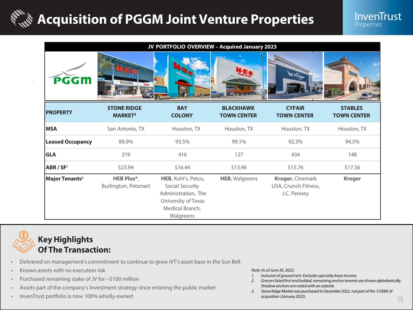 Recent Acquisitions in Sun Belt Markets Purchasing necessity-based retail assets in the Sun Belt delivering stable cash flow ESCARPMENT VILLAGE THE SHOPS AT ARBOR TRAILS BAY LANDING EASTFIELD VILLAGE THE SHOPPES AT DAVIS LAKE MSA: Austin, TX MSA: Austin, TX MSA: Fort Myers, FL MSA: Charlotte, NC MSA: Charlotte, NC • Purchased 2022 • ABR PSF - $21.63 • H-E-B anchored • 100% leased occupancy • 3-mile Avg. HHI - $144,200 • 3-mile Population – 72,000 • Purchased 2022 • ABR PSF - $13.83 • Costco & Whole Foods anchored • 100% leased occupancy • 3-mile Avg. HHI - $118,100 • 3-mile Population – 88,700 • Purchased 2022 • ABR PSF - $10.02 • Fresh Market & HomeGoods • 100% leased occupancy • 3-mile Avg. HHI - $121,400 • 3-mile Population – 47,100 • Purchased 2022 • ABR PSF - $17.64 • Food Lion anchored • 96% leased occupancy • 3-mile Avg. HHI - $103,800 • 3-mile Population – 54,300 • Purchased 2023 • ABR PSF - $16.74 • Harris Teeter anchored • 97% leased occupancy • 3-mile Avg. HHI - $91,300 • 3-mile Population – 70,000 14 Note: As of June 30, 2023