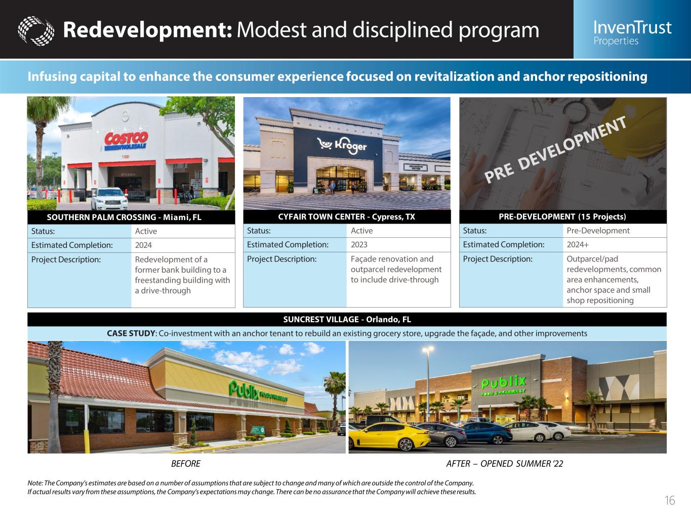 Redevelopment: Modest and disciplined program SOUTHERN PALM CROSSING - Miami, FL Status: Active Estimated Completion: 2024 Project Description: Redevelopment of a former bank building to a freestanding building with a drive-through CYFAIR TOWN CENTER - Cypress, TX Status: Active Estimated Completion: 2023 Project Description: Façade renovation and outparcel redevelopment to include drive-through PRE-DEVELOPMENT (15 Projects) Status: Pre-Development Estimated Completion: 2024+ Project Description: Outparcel/pad redevelopments, common area enhancements, anchor space and small shop repositioning SUNCREST VILLAGE - Orlando, FL CASE STUDY: Co-investment with an anchor tenant to rebuild an existing grocery store, upgrade the façade, and other improvements BEFORE AFTER – OPENED SUMMER ‘22 Note: The Company’s estimates are based on a number of assumptions that are subject to change and many of which are outside the control of the Company. If actual results vary from these assumptions, the Company’s expectations may change. There can be no assurance that the Company will achieve these results. Infusing capital to enhance the consumer experience focused on revitalization and anchor repositioning 16