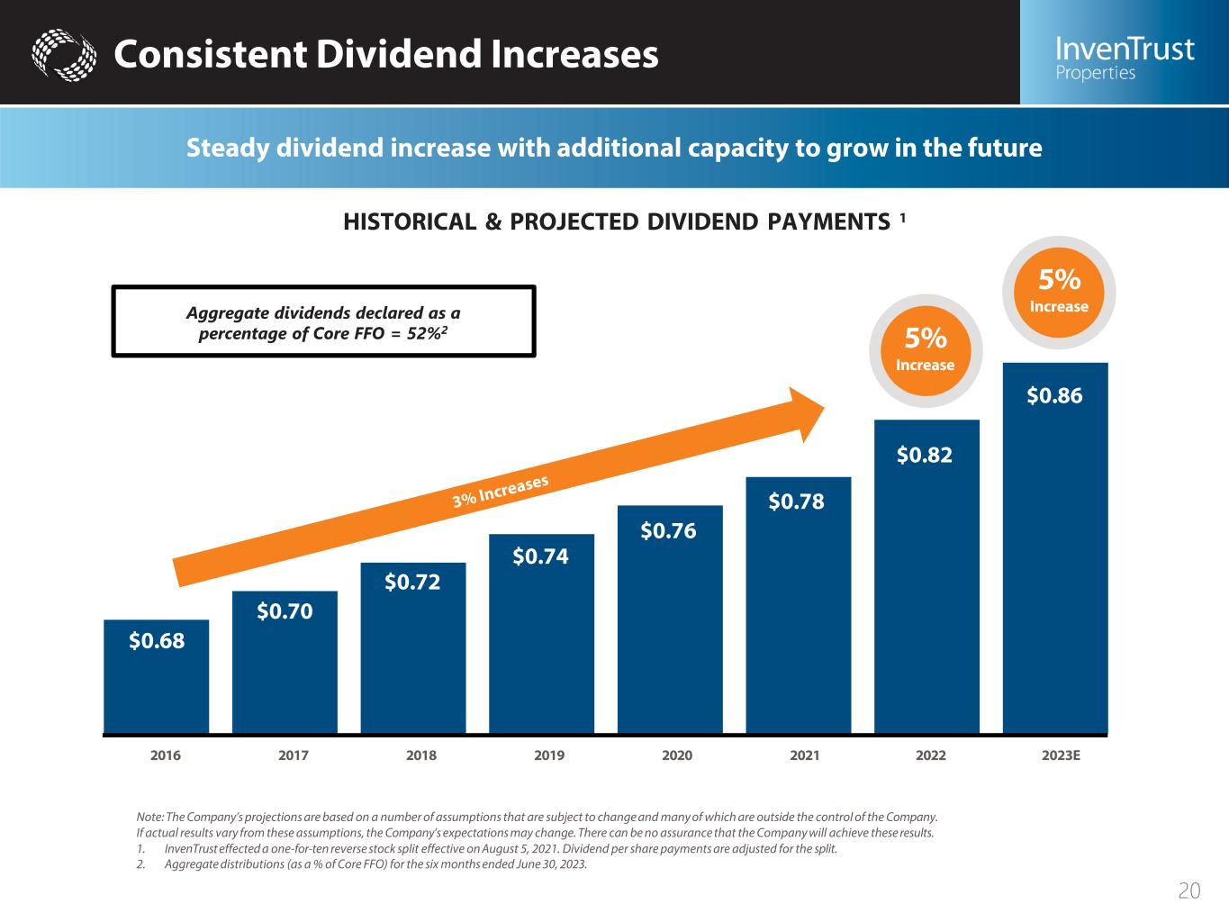 $0.86 $0.82 $0.78 $0.76 $0.74 $0.72 $0.70 $0.68 Consistent Dividend Increases Steady dividend increase with additional capacity to grow in the future HISTORICAL & PROJECTED DIVIDEND PAYMENTS 1 Note: The Company’s projections are based on a number of assumptions that are subject to change and many of which are outside the control of the Company. If actual results vary from these assumptions, the Company’s expectations may change. There can be no assurance that the Company will achieve these results. 1. InvenTrust effected a one-for-ten reverse stock split effective on August 5, 2021. Dividend per share payments are adjusted for the split. 2. Aggregate distributions (as a % of Core FFO) for the six months ended June 30, 2023. Aggregate dividends declared as a percentage of Core FFO = 52%2 2016 2017 2018 2019 2020 2021 2022 2023E 5% Increase 20 5% Increase