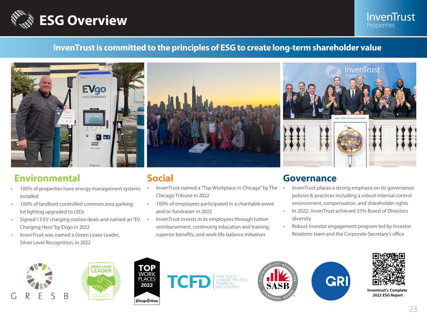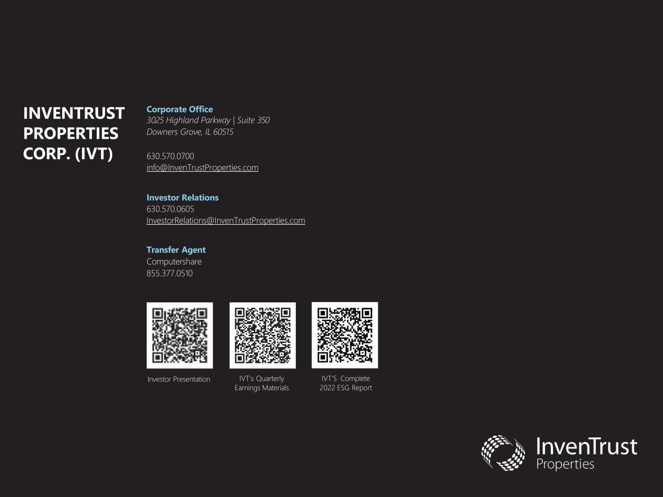 INVENTRUST PROPERTIES CORP. (IVT) Investor Presentation IVT’s Quarterly Earnings Materials IVT’S Complete 2022 ESG Report Corporate Office 3025 Highland Parkway | Suite 350 Downers Grove, IL 60515 630.570.0700 info@InvenTrustProperties.com Investor Relations 630.570.0605 InvestorRelations@InvenTrustProperties.com Transfer Agent Computershare 855.377.0510