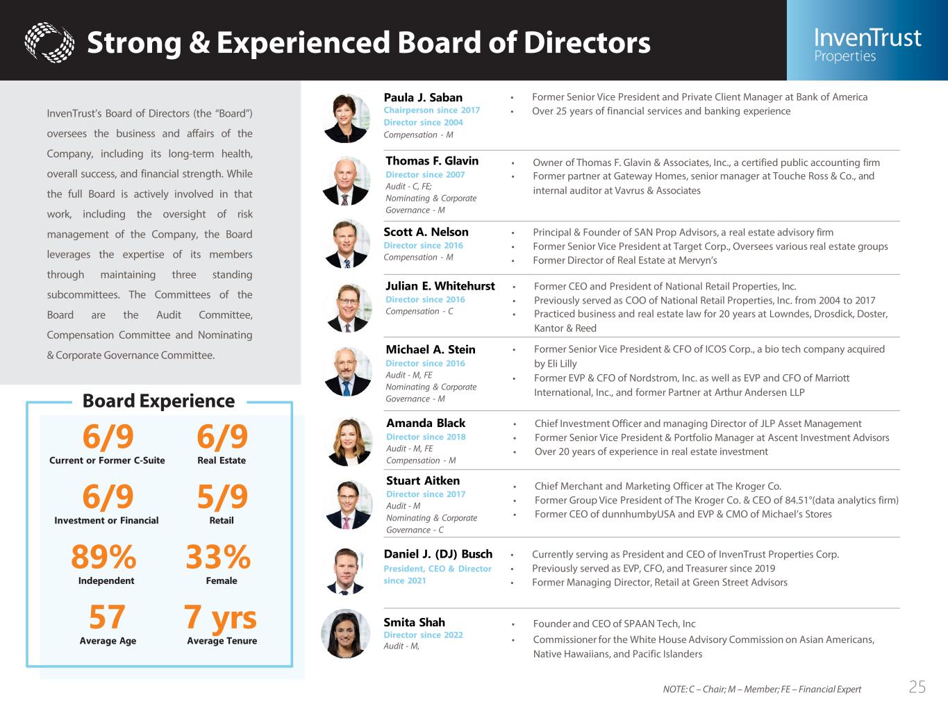 Strong & Experienced Board of Directors Paula J. Saban Chairperson since 2017 Director since 2004 Compensation - M • Former Senior Vice President and Private Client Manager at Bank of America • Over 25 years of financial services and banking experience Thomas F. Glavin Director since 2007 Audit - C, FE; Nominating & Corporate Governance - M • Owner of Thomas F. Glavin & Associates, Inc., a certified public accounting firm • Former partner at Gateway Homes, senior manager at Touche Ross & Co., and internal auditor at Vavrus & Associates Scott A. Nelson Director since 2016 Compensation - M • Principal & Founder of SAN Prop Advisors, a real estate advisory firm • Former Senior Vice President at Target Corp., Oversees various real estate groups • Former Director of Real Estate at Mervyn’s Amanda Black Director since 2018 Audit - M, FE Compensation - M • Chief Investment Officer and managing Director of JLP Asset Management • Former Senior Vice President & Portfolio Manager at Ascent Investment Advisors • Over 20 years of experience in real estate investment Stuart Aitken Director since 2017 Audit - M Nominating & Corporate Governance - C • Chief Merchant and Marketing Officer at The Kroger Co. • Former Group Vice President of The Kroger Co. & CEO of 84.51°(data analytics firm) • Former CEO of dunnhumbyUSA and EVP & CMO of Michael’s Stores Daniel J. (DJ) Busch President, CEO & Director since 2021 • Currently serving as President and CEO of InvenTrust Properties Corp. • Previously served as EVP, CFO, and Treasurer since 2019 • Former Managing Director, Retail at Green Street Advisors Julian E. Whitehurst Director since 2016 Compensation - C • Former CEO and President of National Retail Properties, Inc. • Previously served as COO of National Retail Properties, Inc. from 2004 to 2017 • Practiced business and real estate law for 20 years at Lowndes, Drosdick, Doster, Kantor & Reed Michael A. Stein Director since 2016 Audit - M, FE Nominating & Corporate Governance - M • Former Senior Vice President & CFO of ICOS Corp., a bio tech company acquired by Eli Lilly • Former EVP & CFO of Nordstrom, Inc. as well as EVP and CFO of Marriott International, Inc., and former Partner at Arthur Andersen LLP Smita Shah Director since 2022 Audit - M, InvenTrust’s Board of Directors (the “Board”) oversees the business and affairs of the Company, including its long-term health, overall success, and financial strength. While the full Board is actively involved in that work, including the oversight of risk management of the Company, the Board leverages the expertise of its members through maintaining three standing subcommittees. The Committees of the Board are the Audit Committee, Compensation Committee and Nominating & Corporate Governance Committee. 6/9 5/9 Investment or Financial Retail 6/9 6/9 Current or Former C-Suite Real Estate 89% 33% Independent Female 57 7 yrs Average Age Average Tenure Board Experience NOTE: C – Chair; M – Member; FE – Financial Expert 25 • Founder and CEO of SPAAN Tech, Inc • Commissioner for the White House Advisory Commission on Asian Americans, Native Hawaiians, and Pacific Islanders