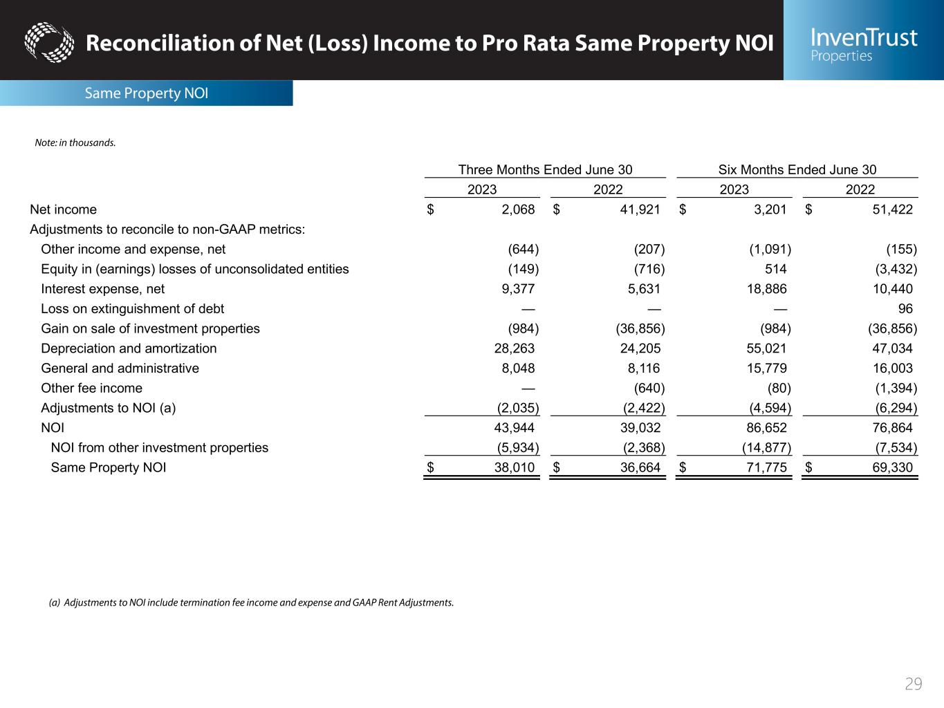 Reconciliation of Non-GAAP Measures Same Property NOI 28 Note: in thousands. Three Months Ended June 30 Six Months Ended June 30 2023 2022 2023 2022 Income Minimum base rent $ 36,029 $ 34,341 $ 68,071 $ 64,693 Real estate tax recoveries 6,982 7,140 13,708 13,005 Common area maintenance, insurance, and other recoveries 6,557 6,583 11,934 11,647 Ground rent income 3,717 3,680 6,868 6,707 Short-term and other lease income 584 1,110 1,849 2,161 Provision for uncollectible billed rent and recoveries (167) (110) (393) (340) Reversal of uncollectible billed rent and recoveries — 240 488 1,083 Other property income 350 310 596 569 Total income 54,052 53,294 103,121 99,525 Operating Expenses Property operating 8,335 8,660 16,081 15,631 Real estate taxes 7,707 7,970 15,265 14,564 Total operating expenses 16,042 16,630 31,346 30,195 Same Property NOI $ 38,010 $ 36,664 $ 71,775 $ 69,330