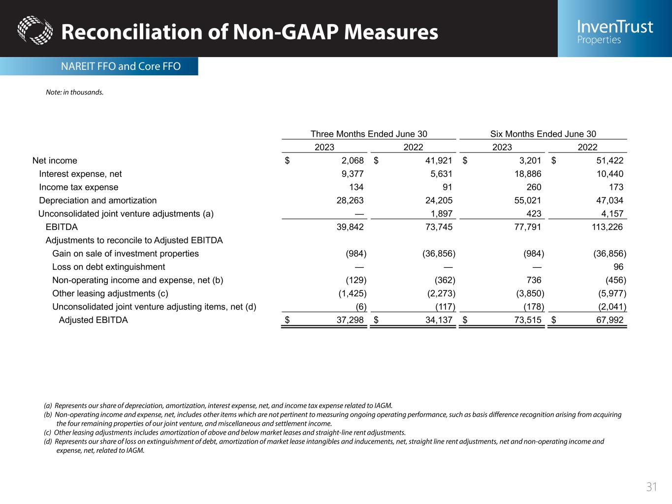 Reconciliation of Non-GAAP Measures EBITDA and Adjusted EBITDA 30 Note: in thousands. Three Months Ended June 30 Six Months Ended June 30 2023 2022 2023 2022 Net income $ 2,068 $ 41,921 $ 3,201 $ 51,422 Depreciation and amortization related to investment properties 28,077 23,996 54,620 46,618 Gain on sale of investment properties (984) (36,856) (984) (36,856) Unconsolidated joint venture adjustments (a) — 1,385 342 920 NAREIT FFO Applicable to Common Shares and Dilutive Securities 29,161 30,446 57,179 62,104 Amortization of market lease intangibles and inducements, net (572) (1,062) (2,088) (3,609) Straight-line rent adjustments, net (853) (1,211) (1,762) (2,368) Adjusting items, net (b) 1,322 524 3,256 1,397 Unconsolidated joint venture adjusting items, net (c) (6) (66) (162) 128 Core FFO Applicable to Common Shares and Dilutive Securities $ 29,052 $ 28,631 $ 56,423 $ 57,652 Weighted average common shares outstanding - basic 67,523,105 67,413,049 67,515,913 67,384,044 Dilutive effect of unvested restricted shares (d) 188,743 137,797 167,313 193,480 Weighted average common shares outstanding - diluted 67,711,848 67,550,846 67,683,226 67,577,524 NAREIT FFO Applicable to Common Shares and Dilutive Securities per share $ 0.43 $ 0.45 $ 0.84 $ 0.92 Core FFO Applicable to Common Shares and Dilutive Securities per share $ 0.43 $ 0.42 $ 0.83 $ 0.85 (a) Represents our share of depreciation, amortization and gain on sale related to investment properties held in IAGM. (b) Adjusting items, net, are primarily loss on extinguishment of debt, amortization of debt discounts and financing costs, depreciation and amortization of corporate assets, and non-operating income and expenses, net, which includes items which are not pertinent to measuring on-going operating performance, such as basis difference recognition arising from acquiring the four remaining properties of our joint venture, and miscellaneous and settlement income. (c) Represents our share of amortization of market lease intangibles and inducements, net, straight line rent adjustments, net and adjusting items, net related to IAGM. (d) For purposes of calculating non-GAAP per share metrics, the same denominator is used as that which would be used in calculating diluted earnings per share in accordance with GAAP.