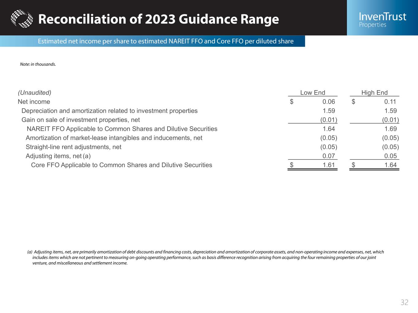 Reconciliation of Non-GAAP Measures NAREIT FFO and Core FFO 31 Note: in thousands. Three Months Ended June 30 Six Months Ended June 30 2023 2022 2023 2022 Net income $ 2,068 $ 41,921 $ 3,201 $ 51,422 Interest expense, net 9,377 5,631 18,886 10,440 Income tax expense 134 91 260 173 Depreciation and amortization 28,263 24,205 55,021 47,034 Unconsolidated joint venture adjustments (a) — 1,897 423 4,157 EBITDA 39,842 73,745 77,791 113,226 Adjustments to reconcile to Adjusted EBITDA Gain on sale of investment properties (984) (36,856) (984) (36,856) Loss on debt extinguishment — — — 96 Non-operating income and expense, net (b) (129) (362) 736 (456) Other leasing adjustments (c) (1,425) (2,273) (3,850) (5,977) Unconsolidated joint venture adjusting items, net (d) (6) (117) (178) (2,041) Adjusted EBITDA $ 37,298 $ 34,137 $ 73,515 $ 67,992 (a) Represents our share of depreciation, amortization, interest expense, net, and income tax expense related to IAGM. (b) Non-operating income and expense, net, includes other items which are not pertinent to measuring ongoing operating performance, such as basis difference recognition arising from acquiring the four remaining properties of our joint venture, and miscellaneous and settlement income. (c) Other leasing adjustments includes amortization of above and below market leases and straight-line rent adjustments. (d) Represents our share of loss on extinguishment of debt, amortization of market lease intangibles and inducements, net, straight line rent adjustments, net and non-operating income and expense, net, related to IAGM.
