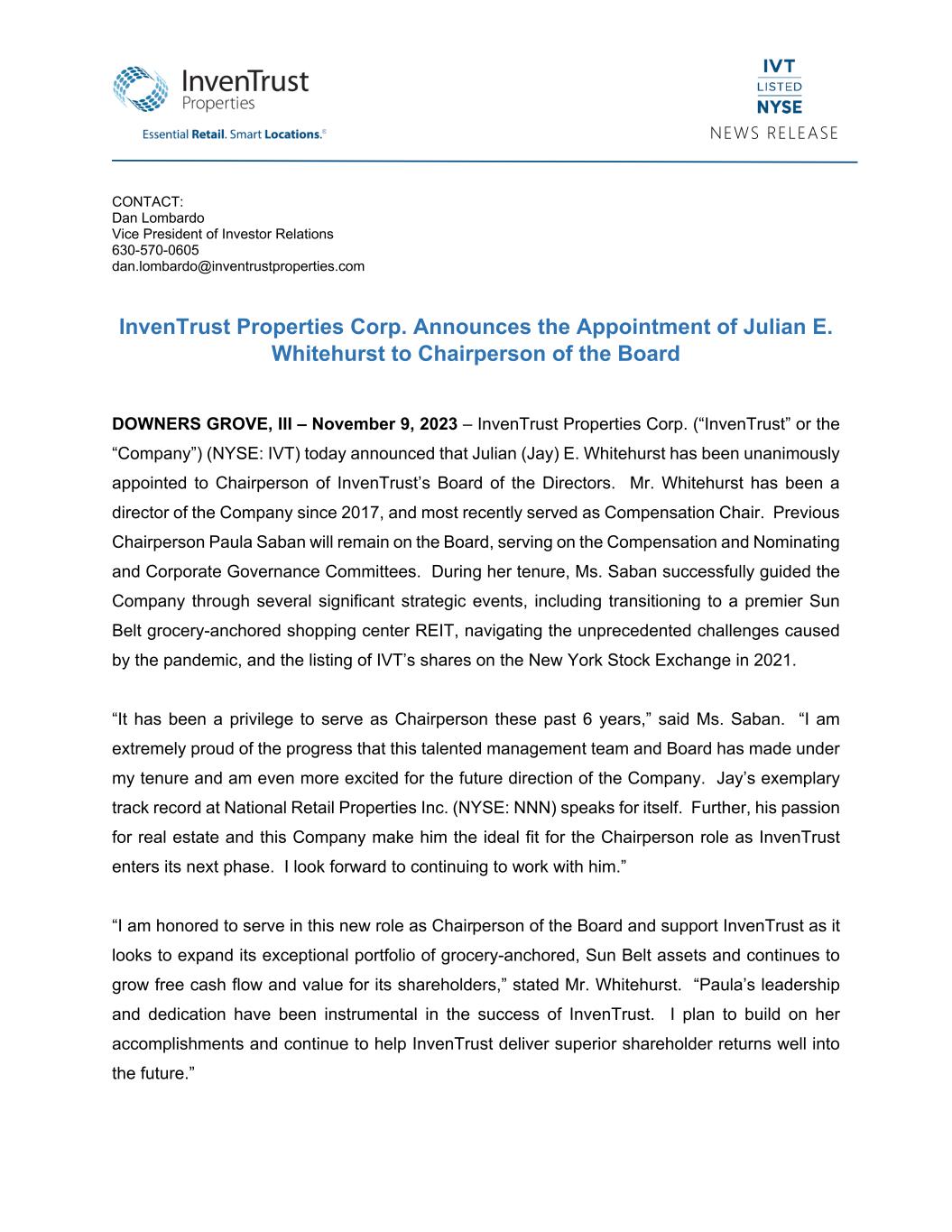NEWS RELEASE   CONTACT: Dan Lombardo Vice President of Investor Relations 630-570-0605 dan.lombardo@inventrustproperties.com InvenTrust Properties Corp. Announces the Appointment of Julian E. Whitehurst to Chairperson of the Board DOWNERS GROVE, III – November 9, 2023 – InvenTrust Properties Corp. (“InvenTrust” or the “Company”) (NYSE: IVT) today announced that Julian (Jay) E. Whitehurst has been unanimously appointed to Chairperson of InvenTrust’s Board of the Directors. Mr. Whitehurst has been a director of the Company since 2017, and most recently served as Compensation Chair. Previous Chairperson Paula Saban will remain on the Board, serving on the Compensation and Nominating and Corporate Governance Committees. During her tenure, Ms. Saban successfully guided the Company through several significant strategic events, including transitioning to a premier Sun Belt grocery-anchored shopping center REIT, navigating the unprecedented challenges caused by the pandemic, and the listing of IVT’s shares on the New York Stock Exchange in 2021. “It has been a privilege to serve as Chairperson these past 6 years,” said Ms. Saban. “I am extremely proud of the progress that this talented management team and Board has made under my tenure and am even more excited for the future direction of the Company. Jay’s exemplary track record at National Retail Properties Inc. (NYSE: NNN) speaks for itself. Further, his passion for real estate and this Company make him the ideal fit for the Chairperson role as InvenTrust enters its next phase. I look forward to continuing to work with him.” “I am honored to serve in this new role as Chairperson of the Board and support InvenTrust as it looks to expand its exceptional portfolio of grocery-anchored, Sun Belt assets and continues to grow free cash flow and value for its shareholders,” stated Mr. Whitehurst. “Paula’s leadership and dedication have been instrumental in the success of InvenTrust. I plan to build on her accomplishments and continue to help InvenTrust deliver superior shareholder returns well into the future.”