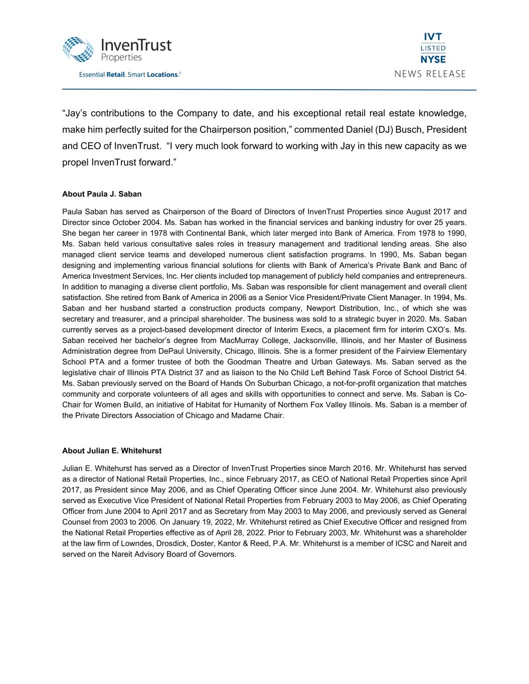 NEWS RELEASE   “Jay’s contributions to the Company to date, and his exceptional retail real estate knowledge, make him perfectly suited for the Chairperson position,” commented Daniel (DJ) Busch, President and CEO of InvenTrust. “I very much look forward to working with Jay in this new capacity as we propel InvenTrust forward.” About Paula J. Saban Paula Saban has served as Chairperson of the Board of Directors of InvenTrust Properties since August 2017 and Director since October 2004. Ms. Saban has worked in the financial services and banking industry for over 25 years. She began her career in 1978 with Continental Bank, which later merged into Bank of America. From 1978 to 1990, Ms. Saban held various consultative sales roles in treasury management and traditional lending areas. She also managed client service teams and developed numerous client satisfaction programs. In 1990, Ms. Saban began designing and implementing various financial solutions for clients with Bank of America’s Private Bank and Banc of America Investment Services, Inc. Her clients included top management of publicly held companies and entrepreneurs. In addition to managing a diverse client portfolio, Ms. Saban was responsible for client management and overall client satisfaction. She retired from Bank of America in 2006 as a Senior Vice President/Private Client Manager. In 1994, Ms. Saban and her husband started a construction products company, Newport Distribution, Inc., of which she was secretary and treasurer, and a principal shareholder. The business was sold to a strategic buyer in 2020. Ms. Saban currently serves as a project-based development director of Interim Execs, a placement firm for interim CXO’s. Ms. Saban received her bachelor’s degree from MacMurray College, Jacksonville, Illinois, and her Master of Business Administration degree from DePaul University, Chicago, Illinois. She is a former president of the Fairview Elementary School PTA and a former trustee of both the Goodman Theatre and Urban Gateways. Ms. Saban served as the legislative chair of Illinois PTA District 37 and as liaison to the No Child Left Behind Task Force of School District 54. Ms. Saban previously served on the Board of Hands On Suburban Chicago, a not-for-profit organization that matches community and corporate volunteers of all ages and skills with opportunities to connect and serve. Ms. Saban is Co- Chair for Women Build, an initiative of Habitat for Humanity of Northern Fox Valley Illinois. Ms. Saban is a member of the Private Directors Association of Chicago and Madame Chair. About Julian E. Whitehurst Julian E. Whitehurst has served as a Director of InvenTrust Properties since March 2016. Mr. Whitehurst has served as a director of National Retail Properties, Inc., since February 2017, as CEO of National Retail Properties since April 2017, as President since May 2006, and as Chief Operating Officer since June 2004. Mr. Whitehurst also previously served as Executive Vice President of National Retail Properties from February 2003 to May 2006, as Chief Operating Officer from June 2004 to April 2017 and as Secretary from May 2003 to May 2006, and previously served as General Counsel from 2003 to 2006. On January 19, 2022, Mr. Whitehurst retired as Chief Executive Officer and resigned from the National Retail Properties effective as of April 28, 2022. Prior to February 2003, Mr. Whitehurst was a shareholder at the law firm of Lowndes, Drosdick, Doster, Kantor & Reed, P.A. Mr. Whitehurst is a member of ICSC and Nareit and served on the Nareit Advisory Board of Governors.