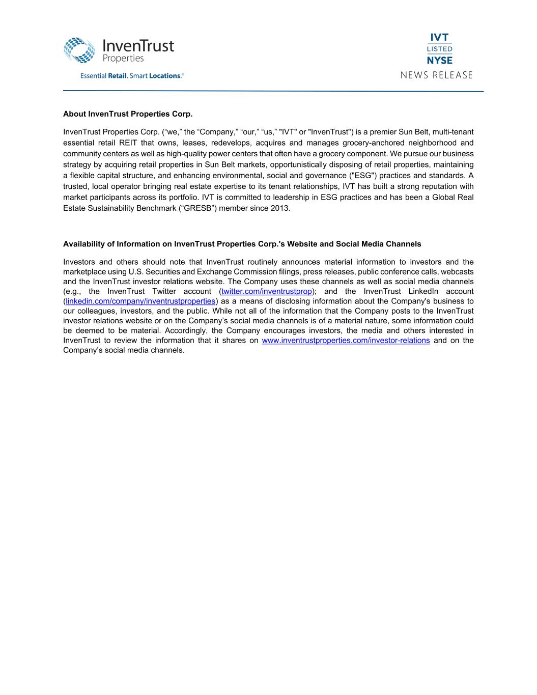 NEWS RELEASE   About InvenTrust Properties Corp. InvenTrust Properties Corp. (“we,” the “Company,” “our,” “us,” "IVT" or "InvenTrust") is a premier Sun Belt, multi-tenant essential retail REIT that owns, leases, redevelops, acquires and manages grocery-anchored neighborhood and community centers as well as high-quality power centers that often have a grocery component. We pursue our business strategy by acquiring retail properties in Sun Belt markets, opportunistically disposing of retail properties, maintaining a flexible capital structure, and enhancing environmental, social and governance ("ESG") practices and standards. A trusted, local operator bringing real estate expertise to its tenant relationships, IVT has built a strong reputation with market participants across its portfolio. IVT is committed to leadership in ESG practices and has been a Global Real Estate Sustainability Benchmark (“GRESB”) member since 2013. Availability of Information on InvenTrust Properties Corp.'s Website and Social Media Channels Investors and others should note that InvenTrust routinely announces material information to investors and the marketplace using U.S. Securities and Exchange Commission filings, press releases, public conference calls, webcasts and the InvenTrust investor relations website. The Company uses these channels as well as social media channels (e.g., the InvenTrust Twitter account (twitter.com/inventrustprop); and the InvenTrust LinkedIn account (linkedin.com/company/inventrustproperties) as a means of disclosing information about the Company's business to our colleagues, investors, and the public. While not all of the information that the Company posts to the InvenTrust investor relations website or on the Company’s social media channels is of a material nature, some information could be deemed to be material. Accordingly, the Company encourages investors, the media and others interested in InvenTrust to review the information that it shares on www.inventrustproperties.com/investor-relations and on the Company’s social media channels.