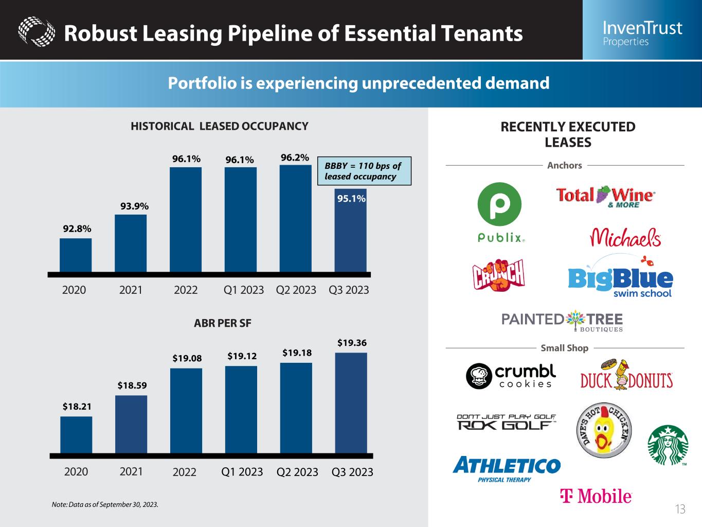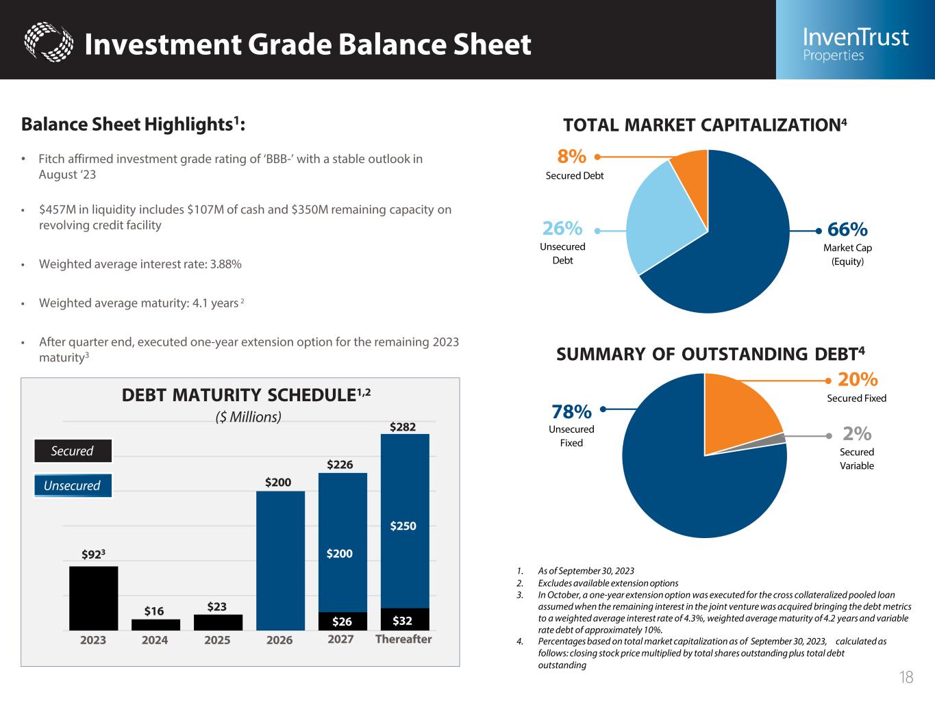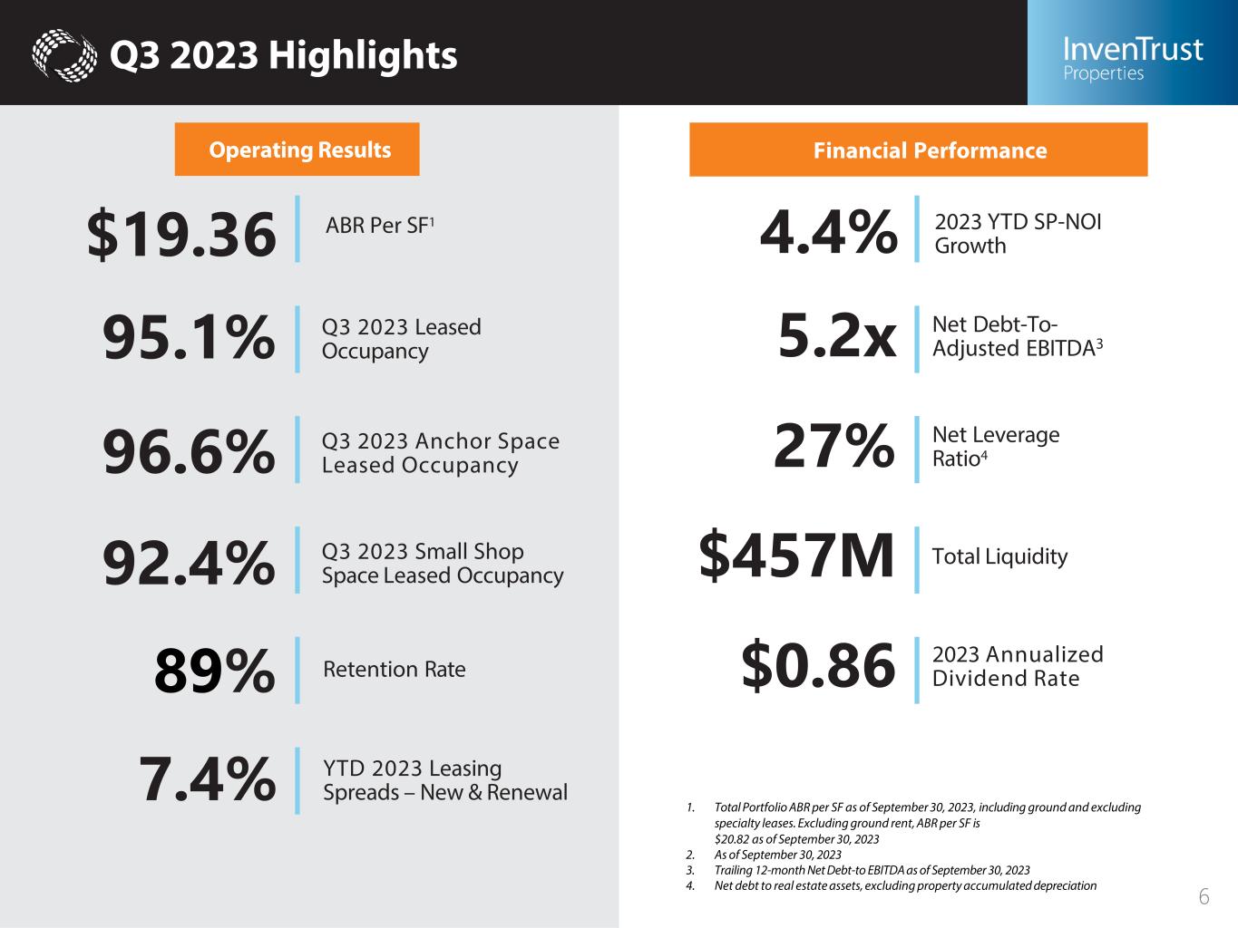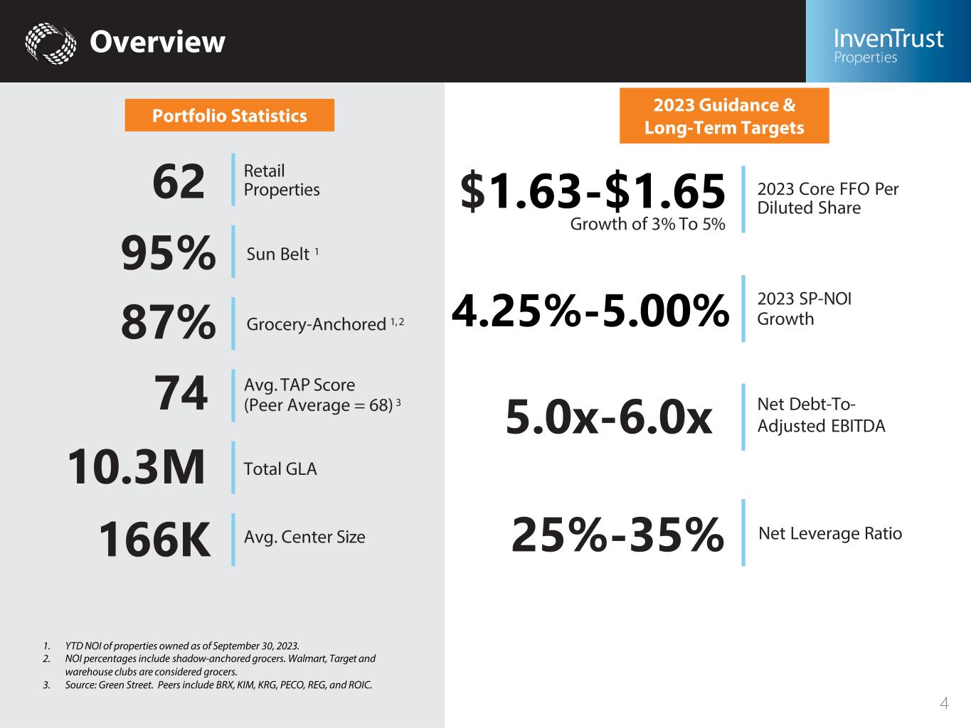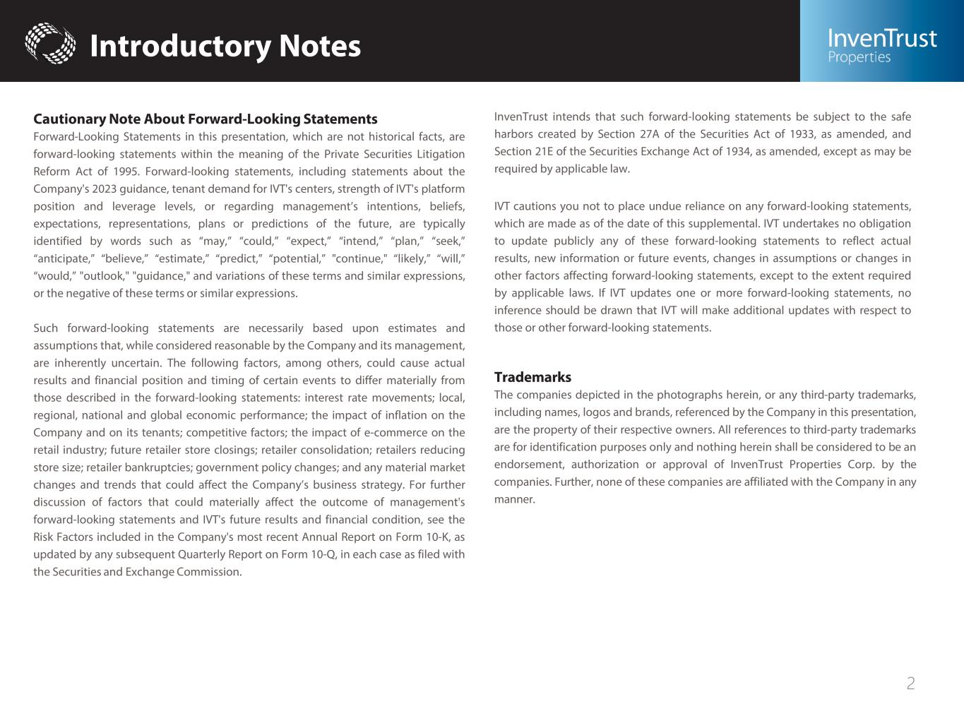 Introductory Notes Cautionary Note About Forward-Looking Statements Forward-Looking Statements in this presentation, which are not historical facts, are forward-looking statements within the meaning of the Private Securities Litigation Reform Act of 1995. Forward-looking statements, including statements about the Company's 2023 guidance, tenant demand for IVT's centers, strength of IVT's platform position and leverage levels, or regarding management’s intentions, beliefs, expectations, representations, plans or predictions of the future, are typically identified by words such as “may,” “could,” “expect,” “intend,” “plan,” “seek,” “anticipate,” “believe,” “estimate,” “predict,” “potential,” "continue," “likely,” “will,” “would,” "outlook," "guidance," and variations of these terms and similar expressions, or the negative of these terms or similar expressions. Such forward-looking statements are necessarily based upon estimates and assumptions that, while considered reasonable by the Company and its management, are inherently uncertain. The following factors, among others, could cause actual results and financial position and timing of certain events to differ materially from those described in the forward-looking statements: interest rate movements; local, regional, national and global economic performance; the impact of inflation on the Company and on its tenants; competitive factors; the impact of e-commerce on the retail industry; future retailer store closings; retailer consolidation; retailers reducing store size; retailer bankruptcies; government policy changes; and any material market changes and trends that could affect the Company’s business strategy. For further discussion of factors that could materially affect the outcome of management's forward-looking statements and IVT's future results and financial condition, see the Risk Factors included in the Company's most recent Annual Report on Form 10-K, as updated by any subsequent Quarterly Report on Form 10-Q, in each case as filed with the Securities and Exchange Commission. InvenTrust intends that such forward-looking statements be subject to the safe harbors created by Section 27A of the Securities Act of 1933, as amended, and Section 21E of the Securities Exchange Act of 1934, as amended, except as may be required by applicable law. IVT cautions you not to place undue reliance on any forward-looking statements, which are made as of the date of this supplemental. IVT undertakes no obligation to update publicly any of these forward-looking statements to reflect actual results, new information or future events, changes in assumptions or changes in other factors affecting forward-looking statements, except to the extent required by applicable laws. If IVT updates one or more forward-looking statements, no inference should be drawn that IVT will make additional updates with respect to those or other forward-looking statements. Trademarks The companies depicted in the photographs herein, or any third-party trademarks, including names, logos and brands, referenced by the Company in this presentation, are the property of their respective owners. All references to third-party trademarks are for identification purposes only and nothing herein shall be considered to be an endorsement, authorization or approval of InvenTrust Properties Corp. by the companies. Further, none of these companies are affiliated with the Company in any manner. 2
