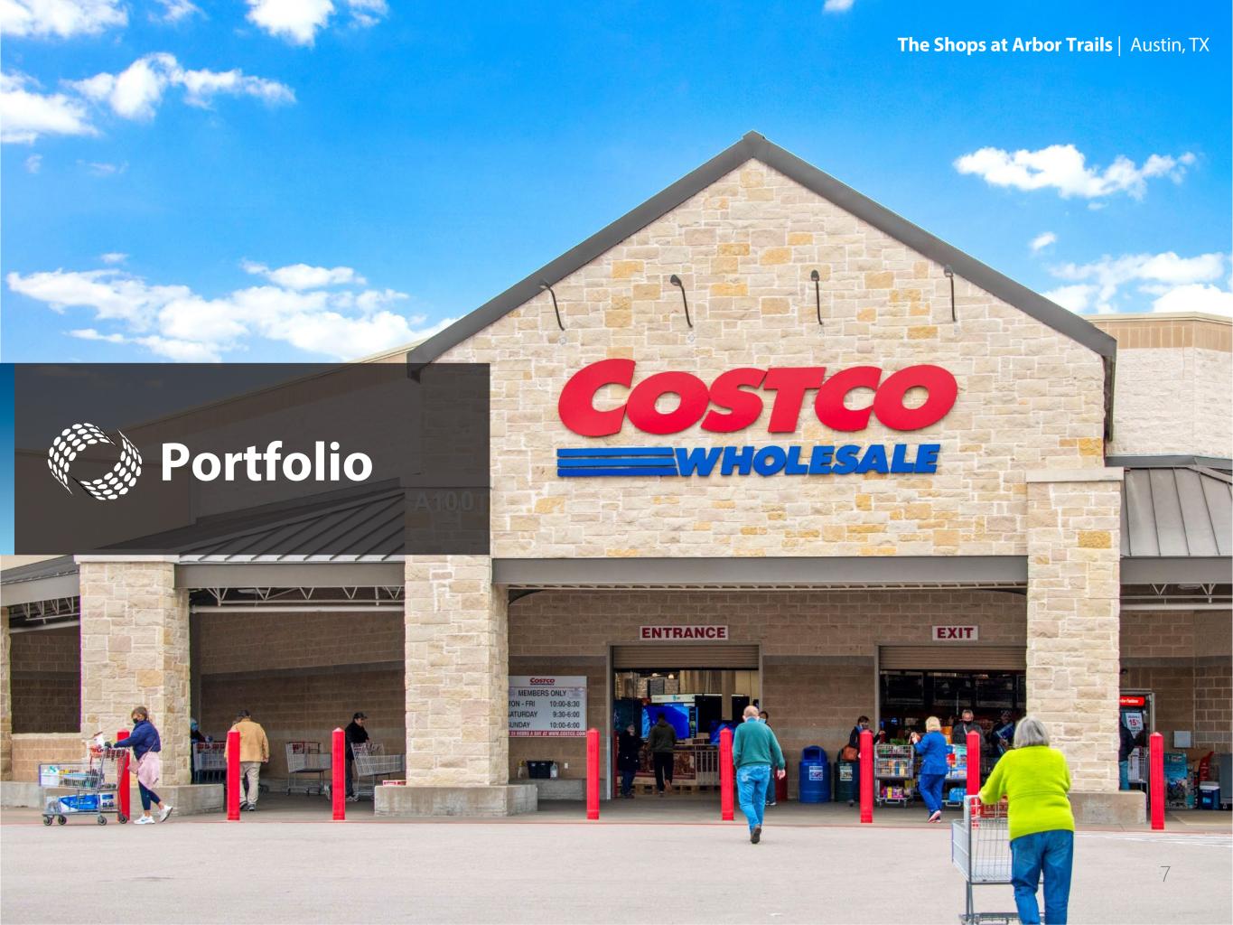 Q3 2023 Highlights Operating Results Financial Performance Q3 2023 Leased Occupancy ABR Per SF1 Retention Rate Q3 2023 Anchor Space Leased Occupancy YTD 2023 Leasing Spreads – New & Renewal Q3 2023 Small Shop Space Leased Occupancy Net Debt-To- Adjusted EBITDA3 Net Leverage Ratio4 Total Liquidity 2023 Annualized Dividend Rate 2023 YTD SP-NOI Growth 1. Total Portfolio ABR per SF as of September 30, 2023, including ground and excluding specialty leases. Excluding ground rent, ABR per SF is $20.82 as of September 30, 2023 2. As of September 30, 2023 3. Trailing 12-month Net Debt-to EBITDA as of September 30, 2023 4. Net debt to real estate assets, excluding property accumulated depreciation 6 95.1% $19.36 89% 7.4% 96.6% 92.4% 5.2x 27% $457M $0.86 4.4%
