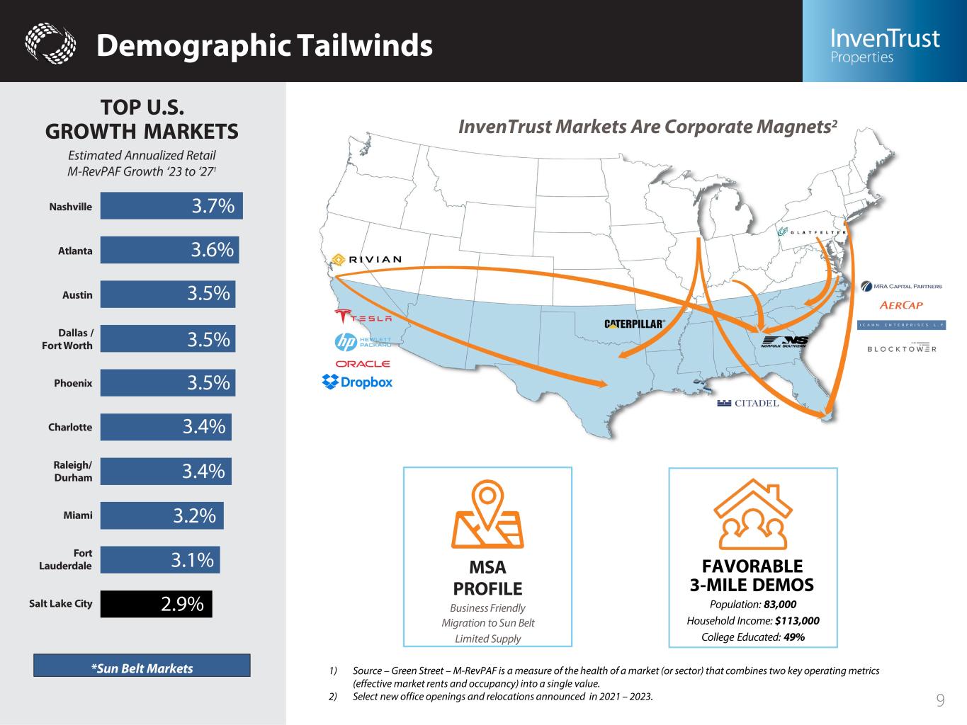 Sun Belt Focused Atlanta 10%Houston 11% Miami 10% Top 5 60% Top 5 Markets by ABR Percentage of Total Concentrated portfolio in markets with strong demographic trends InvenTrust Portfolio by Percentage of ABR Southern CA 12% San Antonio 3% Austin 17% Dallas/Fort Worth/ Arlington 10% Houston 11% Atlanta 10% Tampa/St. Pete’s 5% Miami/Fort Lauderdale/ West Palm Beach 10% Orlando 5% Charlotte 5% Raleigh / Durham 7% DC Metro 3% 8 Austin 17% Southern CA 12% Richmond 2%