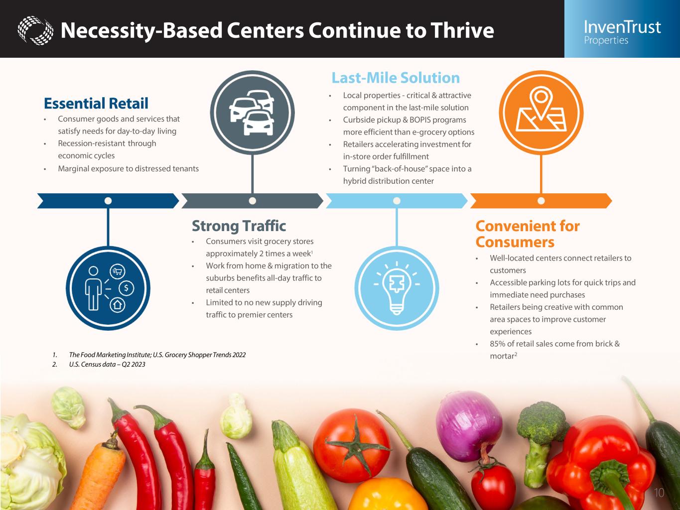 Demographic Tailwinds Nashville Atlanta Austin Dallas / Fort Worth Phoenix Charlotte Raleigh/ Durham Miami Fort Lauderdale Salt Lake City *Sun Belt Markets TOP U.S. GROWTH MARKETS Estimated Annualized Retail M-RevPAF Growth ‘23 to ‘271 InvenTrust Markets Are Corporate Magnets2 FAVORABLE 3-MILE DEMOS Population: 83,000 Household Income: $113,000 College Educated: 49% MSA PROFILE Business Friendly Migration to Sun Belt Limited Supply 9 3.7% 3.6% 3.5% 3.5% 3.5% 3.4% 3.4% 3.2% 3.1% 2.9% 1) Source – Green Street – M-RevPAF is a measure of the health of a market (or sector) that combines two key operating metrics (effective market rents and occupancy) into a single value. 2) Select new office openings and relocations announced in 2021 – 2023.