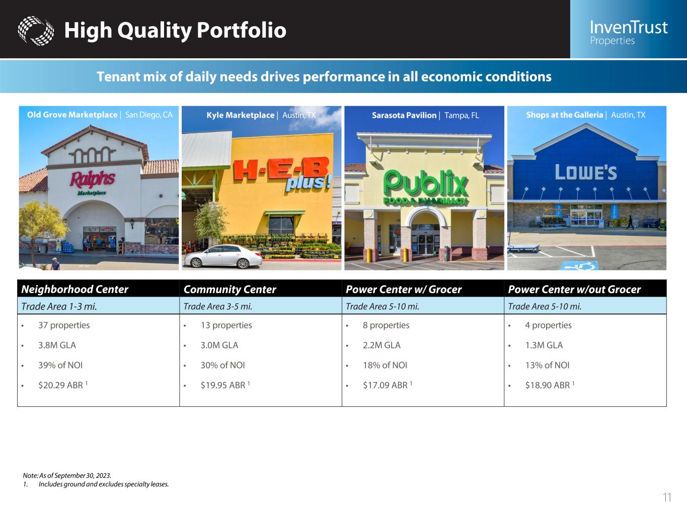 Add Page Numbers in PPT Necessity-Based Centers Continue to Thrive Essential Retail • Consumer goods and services that satisfy needs for day-to-day living • Recession-resistant through economic cycles • Marginal exposure to distressed tenants Strong Traffic • Consumers visit grocery stores approximately 2 times a week1 • Work from home & migration to the suburbs benefits all-day traffic to retail centers • Limited to no new supply driving traffic to premier centers Last-Mile Solution • Local properties - critical & attractive component in the last-mile solution • Curbside pickup & BOPIS programs more efficient than e-grocery options • Retailers accelerating investment for in-store order fulfillment • Turning “back-of-house” space into a hybrid distribution center Convenient for Consumers • Well-located centers connect retailers to customers • Accessible parking lots for quick trips and immediate need purchases • Retailers being creative with common area spaces to improve customer experiences • 85% of retail sales come from brick & mortar21. The Food Marketing Institute; U.S. Grocery Shopper Trends 2022 2. U.S. Census data – Q2 2023 10