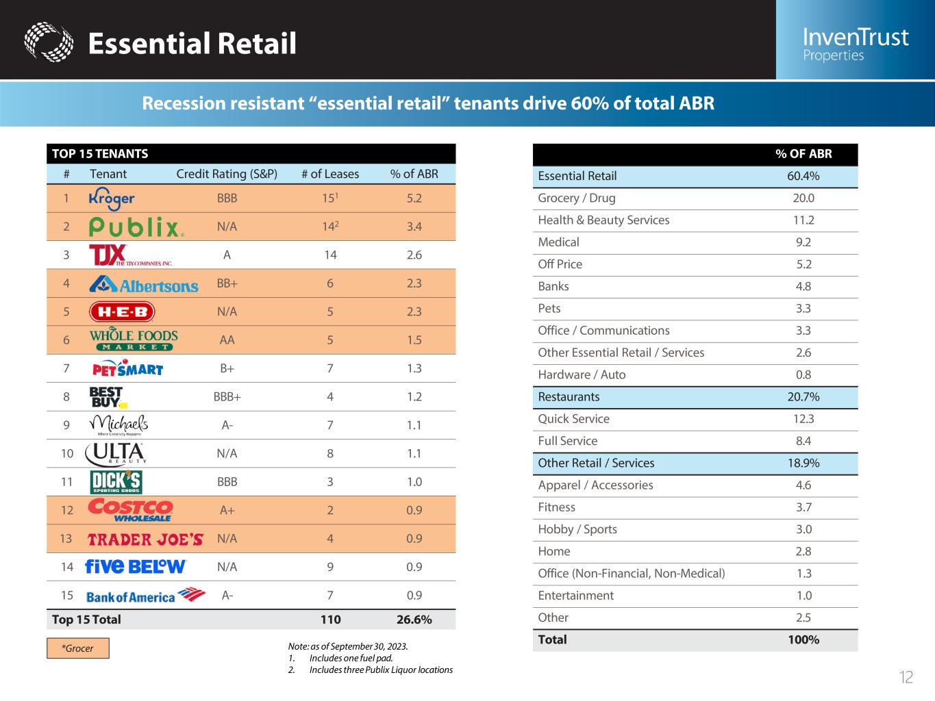 High Quality Portfolio Tenant mix of daily needs drives performance in all economic conditions Neighborhood Center Community Center Power Center w/ Grocer Power Center w/out Grocer Trade Area 1-3 mi. Trade Area 3-5 mi. Trade Area 5-10 mi. Trade Area 5-10 mi. • 37 properties • 3.8M GLA • 39% of NOI • $20.29 ABR 1 • 13 properties • 3.0M GLA • 30% of NOI • $19.95 ABR 1 • 8 properties • 2.2M GLA • 18% of NOI • $17.09 ABR 1 • 4 properties • 1.3M GLA • 13% of NOI • $18.90 ABR 1 Note: As of September 30, 2023. 1. Includes ground and excludes specialty leases. 11 Old Grove Marketplace | San Diego, CA Shops at the Galleria | Austin, TXSarasota Pavilion | Tampa, FLKyle Marketplace | Austin, TX