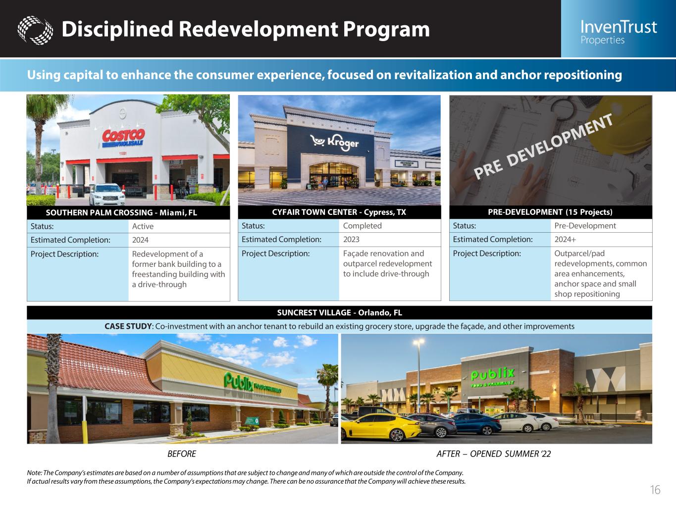 JV PORTFOLIO OVERVIEW – Acquired January 2023 Add Page Numbers in PPT Acquisition of PGGM Joint Venture Properties PROPERTY STONE RIDGE MARKET3 BAY COLONY BLACKHAWK TOWN CENTER CYFAIR TOWN CENTER STABLES TOWN CENTER MSA San Antonio, TX Houston, TX Houston, TX Houston, TX Houston, TX Leased Occupancy 94.2% 93.7% 99.1% 92.3% 93.6% GLA 219 416 127 434 148 ABR / SF1 $24.11 $16.44 $14.00 $16.01 $17.51 Major Tenants2 HEB Plus*, HEB, Kohl’s, Petco, HEB, Walgreens Kroger, Cinemark Kroger Burlington, PetSmart Social Security USA, Crunch Fitness, Administration, The J.C. Penney University of Texas Medical Branch, LA Fitness, Walgreens Note: As of September 30, 2023. 1. Inclusive of ground rent. Excludes specialty lease income. 2. Shadow anchors are noted with an asterisk. 3. Stone Ridge Market was purchased in December 2022, not part of the $100M JV acquisition (January 2023). Key Highlights Of The Transaction: • Delivered on management’s commitment to continue to grow IVT’s asset base in the Sun Belt • Known assets with no execution risk • Purchased remaining stake of JV for ~$100 million • Assets part of the company’s investment strategy since entering the public market • InvenTrust portfolio is now 100% wholly-owned 15