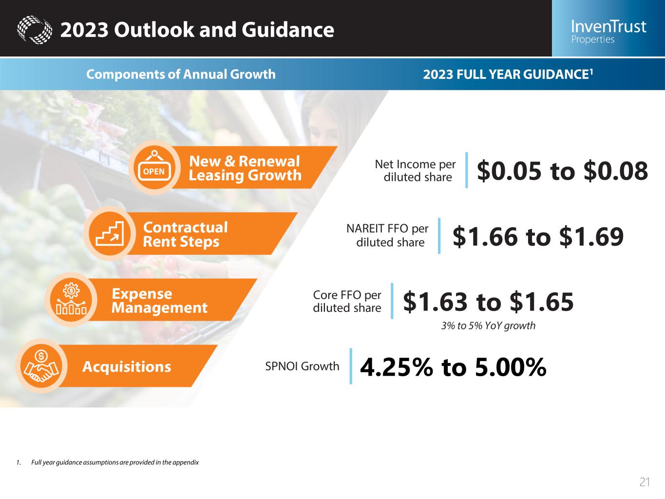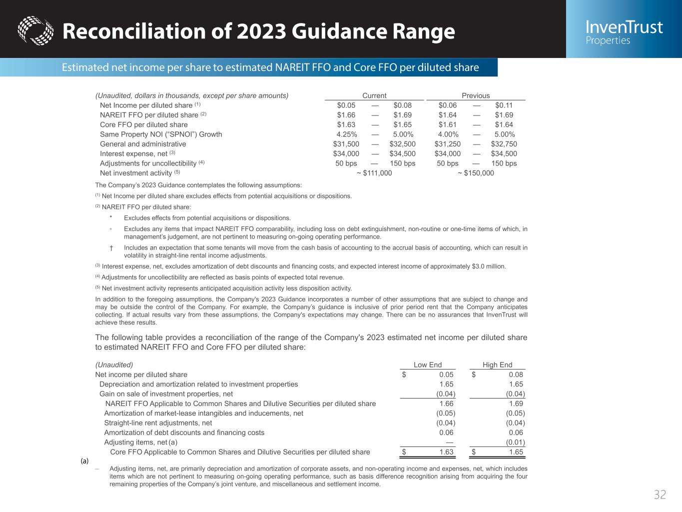 Reconciliation of 2023 Guidance Range Estimated net income per share to estimated NAREIT FFO and Core FFO per diluted share 32 (Unaudited, dollars in thousands, except per share amounts) Current Previous Net Income per diluted share (1) $0.05 — $0.08 $0.06 — $0.11 NAREIT FFO per diluted share (2) $1.66 — $1.69 $1.64 — $1.69 Core FFO per diluted share $1.63 — $1.65 $1.61 — $1.64 Same Property NOI (“SPNOI”) Growth 4.25% — 5.00% 4.00% — 5.00% General and administrative $31,500 — $32,500 $31,250 — $32,750 Interest expense, net (3) $34,000 — $34,500 $34,000 — $34,500 Adjustments for uncollectibility (4) 50 bps — 150 bps 50 bps — 150 bps Net investment activity (5) ~ $111,000 ~ $150,000 The Company’s 2023 Guidance contemplates the following assumptions: (1) Net Income per diluted share excludes effects from potential acquisitions or dispositions. (2) NAREIT FFO per diluted share: * Excludes effects from potential acquisitions or dispositions. ◦ Excludes any items that impact NAREIT FFO comparability, including loss on debt extinguishment, non-routine or one-time items of which, in management’s judgement, are not pertinent to measuring on-going operating performance. † Includes an expectation that some tenants will move from the cash basis of accounting to the accrual basis of accounting, which can result in volatility in straight-line rental income adjustments. (3) Interest expense, net, excludes amortization of debt discounts and financing costs, and expected interest income of approximately $3.0 million. (4) Adjustments for uncollectibility are reflected as basis points of expected total revenue. (5) Net investment activity represents anticipated acquisition activity less disposition activity. In addition to the foregoing assumptions, the Company's 2023 Guidance incorporates a number of other assumptions that are subject to change and may be outside the control of the Company. For example, the Company’s guidance is inclusive of prior period rent that the Company anticipates collecting. If actual results vary from these assumptions, the Company's expectations may change. There can be no assurances that InvenTrust will achieve these results. The following table provides a reconciliation of the range of the Company's 2023 estimated net income per diluted share to estimated NAREIT FFO and Core FFO per diluted share: (Unaudited) Low End High End Net income per diluted share $ 0.05 $ 0.08 Depreciation and amortization related to investment properties 1.65 1.65 Gain on sale of investment properties, net (0.04) (0.04) NAREIT FFO Applicable to Common Shares and Dilutive Securities per diluted share 1.66 1.69 Amortization of market-lease intangibles and inducements, net (0.05) (0.05) Straight-line rent adjustments, net (0.04) (0.04) Amortization of debt discounts and financing costs 0.06 0.06 Adjusting items, net (a) — (0.01) Core FFO Applicable to Common Shares and Dilutive Securities per diluted share $ 1.63 $ 1.65 – Adjusting items, net, are primarily depreciation and amortization of corporate assets, and non-operating income and expenses, net, which includes items which are not pertinent to measuring on-going operating performance, such as basis difference recognition arising from acquiring the four remaining properties of the Company’s joint venture, and miscellaneous and settlement income. (a)