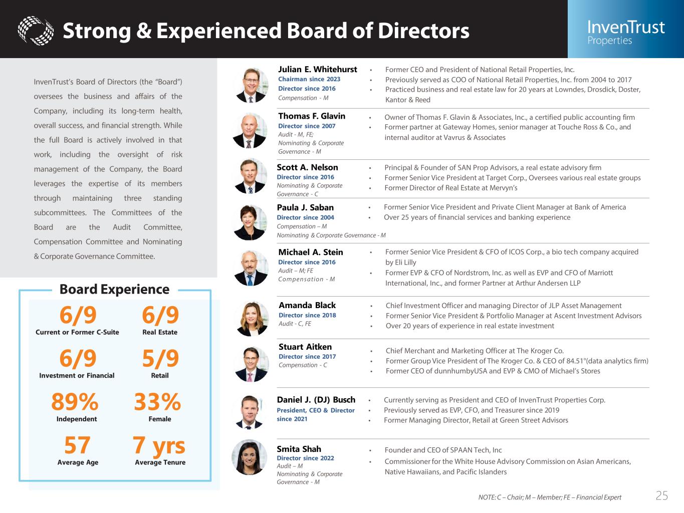 Strong & Experienced Board of Directors Paula J. Saban Director since 2004 Compensation – M Nominating & Corporate Governance - M • Former Senior Vice President and Private Client Manager at Bank of America • Over 25 years of financial services and banking experience Thomas F. Glavin Director since 2007 Audit - M, FE; Nominating & Corporate Governance - M • Owner of Thomas F. Glavin & Associates, Inc., a certified public accounting firm • Former partner at Gateway Homes, senior manager at Touche Ross & Co., and internal auditor at Vavrus & Associates Scott A. Nelson Director since 2016 Nominating & Corporate Governance - C • Principal & Founder of SAN Prop Advisors, a real estate advisory firm • Former Senior Vice President at Target Corp., Oversees various real estate groups • Former Director of Real Estate at Mervyn’s Amanda Black Director since 2018 Audit - C, FE • Chief Investment Officer and managing Director of JLP Asset Management • Former Senior Vice President & Portfolio Manager at Ascent Investment Advisors • Over 20 years of experience in real estate investment Stuart Aitken Director since 2017 Compensation - C • Chief Merchant and Marketing Officer at The Kroger Co. • Former Group Vice President of The Kroger Co. & CEO of 84.51°(data analytics firm) • Former CEO of dunnhumbyUSA and EVP & CMO of Michael’s Stores Daniel J. (DJ) Busch President, CEO & Director since 2021 • Currently serving as President and CEO of InvenTrust Properties Corp. • Previously served as EVP, CFO, and Treasurer since 2019 • Former Managing Director, Retail at Green Street Advisors Julian E. Whitehurst Chairman since 2023 Director since 2016 Compensation - M • Former CEO and President of National Retail Properties, Inc. • Previously served as COO of National Retail Properties, Inc. from 2004 to 2017 • Practiced business and real estate law for 20 years at Lowndes, Drosdick, Doster, Kantor & Reed Michael A. Stein Director since 2016 Audit – M; FE Compens ation - M • Former Senior Vice President & CFO of ICOS Corp., a bio tech company acquired by Eli Lilly • Former EVP & CFO of Nordstrom, Inc. as well as EVP and CFO of Marriott International, Inc., and former Partner at Arthur Andersen LLP Smita Shah Director since 2022 Audit – M Nominating & Corporate Governance - M InvenTrust’s Board of Directors (the “Board”) oversees the business and affairs of the Company, including its long-term health, overall success, and financial strength. While the full Board is actively involved in that work, including the oversight of risk management of the Company, the Board leverages the expertise of its members through maintaining three standing subcommittees. The Committees of the Board are the Audit Committee, Compensation Committee and Nominating & Corporate Governance Committee. 6/9 5/9 Investment or Financial Retail 6/9 6/9 Current or Former C-Suite Real Estate 89% 33% Independent Female 57 7 yrs Average Age Average Tenure Board Experience NOTE: C – Chair; M – Member; FE – Financial Expert 25 • Founder and CEO of SPAAN Tech, Inc • Commissioner for the White House Advisory Commission on Asian Americans, Native Hawaiians, and Pacific Islanders