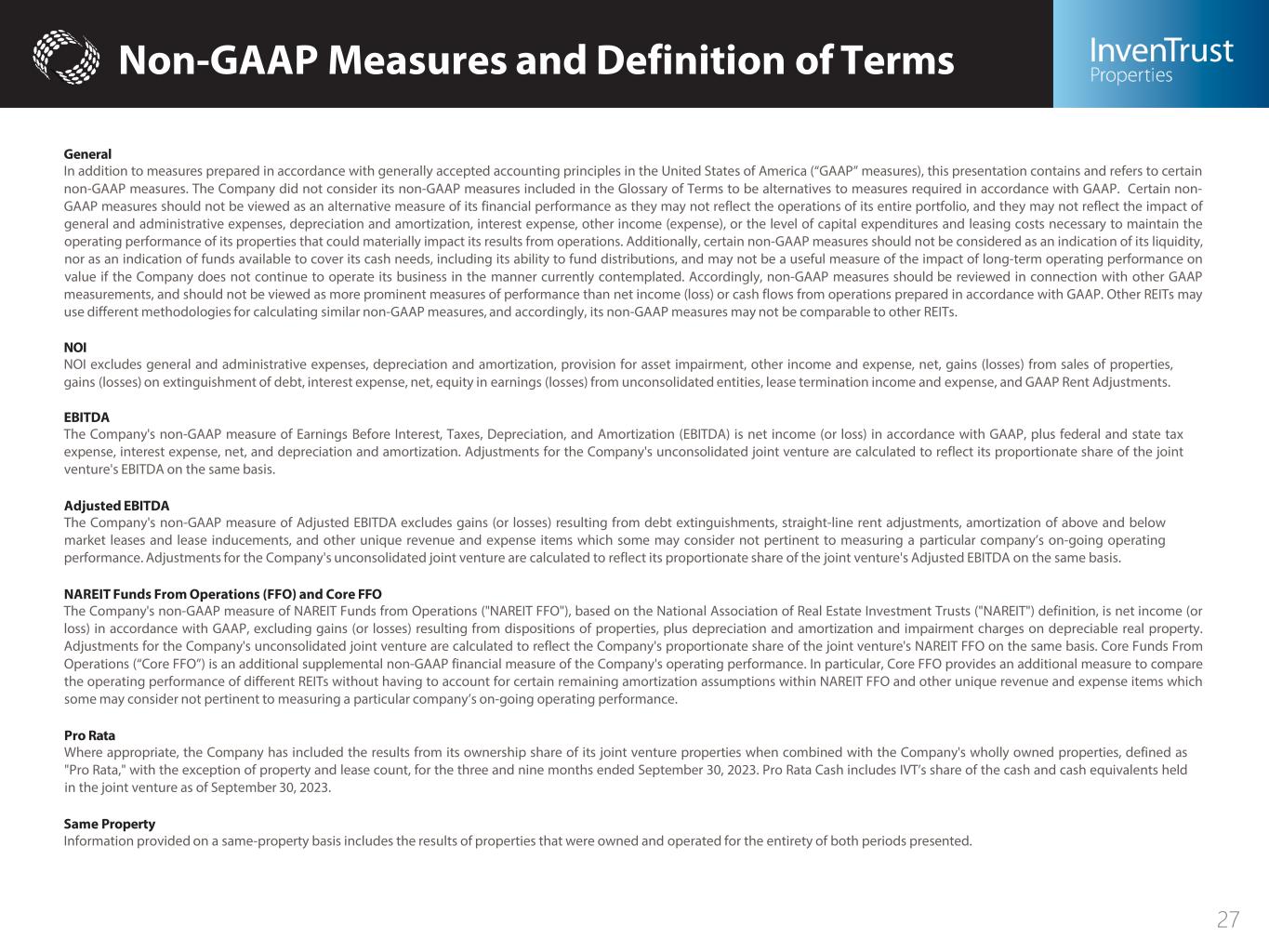 Non-GAAP Measures and Definition of Terms General In addition to measures prepared in accordance with generally accepted accounting principles in the United States of America (“GAAP” measures), this presentation contains and refers to certain non-GAAP measures. The Company did not consider its non-GAAP measures included in the Glossary of Terms to be alternatives to measures required in accordance with GAAP. Certain non- GAAP measures should not be viewed as an alternative measure of its financial performance as they may not reflect the operations of its entire portfolio, and they may not reflect the impact of general and administrative expenses, depreciation and amortization, interest expense, other income (expense), or the level of capital expenditures and leasing costs necessary to maintain the operating performance of its properties that could materially impact its results from operations. Additionally, certain non-GAAP measures should not be considered as an indication of its liquidity, nor as an indication of funds available to cover its cash needs, including its ability to fund distributions, and may not be a useful measure of the impact of long-term operating performance on value if the Company does not continue to operate its business in the manner currently contemplated. Accordingly, non-GAAP measures should be reviewed in connection with other GAAP measurements, and should not be viewed as more prominent measures of performance than net income (loss) or cash flows from operations prepared in accordance with GAAP. Other REITs may use different methodologies for calculating similar non-GAAP measures, and accordingly, its non-GAAP measures may not be comparable to other REITs. NOI NOI excludes general and administrative expenses, depreciation and amortization, provision for asset impairment, other income and expense, net, gains (losses) from sales of properties, gains (losses) on extinguishment of debt, interest expense, net, equity in earnings (losses) from unconsolidated entities, lease termination income and expense, and GAAP Rent Adjustments. EBITDA The Company's non-GAAP measure of Earnings Before Interest, Taxes, Depreciation, and Amortization (EBITDA) is net income (or loss) in accordance with GAAP, plus federal and state tax expense, interest expense, net, and depreciation and amortization. Adjustments for the Company's unconsolidated joint venture are calculated to reflect its proportionate share of the joint venture's EBITDA on the same basis. Adjusted EBITDA The Company's non-GAAP measure of Adjusted EBITDA excludes gains (or losses) resulting from debt extinguishments, straight-line rent adjustments, amortization of above and below market leases and lease inducements, and other unique revenue and expense items which some may consider not pertinent to measuring a particular company’s on-going operating performance. Adjustments for the Company's unconsolidated joint venture are calculated to reflect its proportionate share of the joint venture's Adjusted EBITDA on the same basis. NAREIT Funds From Operations (FFO) and Core FFO The Company's non-GAAP measure of NAREIT Funds from Operations ("NAREIT FFO"), based on the National Association of Real Estate Investment Trusts ("NAREIT") definition, is net income (or loss) in accordance with GAAP, excluding gains (or losses) resulting from dispositions of properties, plus depreciation and amortization and impairment charges on depreciable real property. Adjustments for the Company's unconsolidated joint venture are calculated to reflect the Company's proportionate share of the joint venture's NAREIT FFO on the same basis. Core Funds From Operations (“Core FFO”) is an additional supplemental non-GAAP financial measure of the Company's operating performance. In particular, Core FFO provides an additional measure to compare the operating performance of different REITs without having to account for certain remaining amortization assumptions within NAREIT FFO and other unique revenue and expense items which some may consider not pertinent to measuring a particular company’s on-going operating performance. Pro Rata Where appropriate, the Company has included the results from its ownership share of its joint venture properties when combined with the Company's wholly owned properties, defined as "Pro Rata," with the exception of property and lease count, for the three and nine months ended September 30, 2023. Pro Rata Cash includes IVT’s share of the cash and cash equivalents held in the joint venture as of September 30, 2023. Same Property Information provided on a same-property basis includes the results of properties that were owned and operated for the entirety of both periods presented. 27