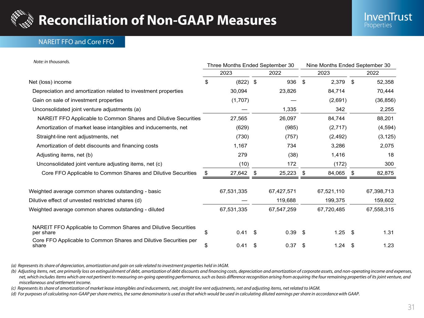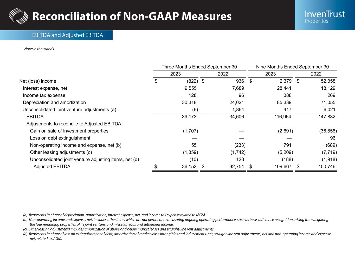 Reconciliation of Non-GAAP Measures EBITDA and Adjusted EBITDA Note: in thousands. (a) Represents its share of depreciation, amortization, interest expense, net, and income tax expense related to IAGM. (b) Non-operating income and expense, net, includes other items which are not pertinent to measuring ongoing operating performance, such as basis difference recognition arising from acquiring the four remaining properties of its joint venture, and miscellaneous and settlement income. (c) Other leasing adjustments includes amortization of above and below market leases and straight-line rent adjustments. (d) Represents its share of loss on extinguishment of debt, amortization of market lease intangibles and inducements, net, straight line rent adjustments, net and non-operating income and expense, net, related to IAGM. Three Months Ended September 30 Nine Months Ended September 30 2023 2022 2023 2022 Net (loss) income $ (822) $ 936 $ 2,379 $ 52,358 Interest expense, net 9,555 7,689 28,441 18,129 Income tax expense 128 96 388 269 Depreciation and amortization 30,318 24,021 85,339 71,055 Unconsolidated joint venture adjustments (a) (6) 1,864 417 6,021 EBITDA 39,173 34,606 116,964 147,832 Adjustments to reconcile to Adjusted EBITDA Gain on sale of investment properties (1,707) — (2,691) (36,856) Loss on debt extinguishment — — — 96 Non-operating income and expense, net (b) 55 (233) 791 (689) Other leasing adjustments (c) (1,359) (1,742) (5,209) (7,719) Unconsolidated joint venture adjusting items, net (d) (10) 123 (188) (1,918) Adjusted EBITDA $ 36,152 $ 32,754 $ 109,667 $ 100,746