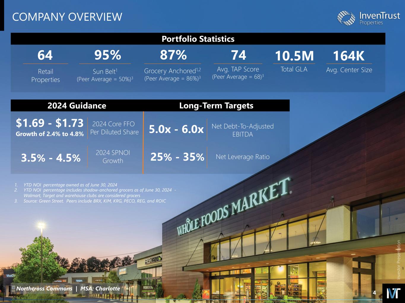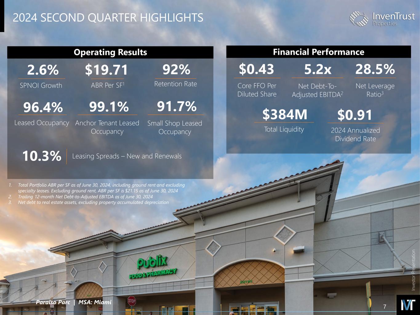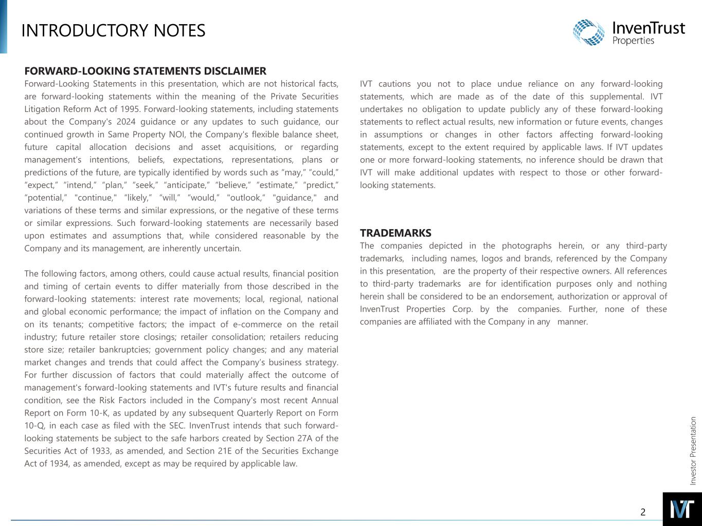In ve sto r P re se nt at io n INTRODUCTORY NOTES FORWARD-LOOKING STATEMENTS DISCLAIMER Forward-Looking Statements in this presentation, which are not historical facts, are forward-looking statements within the meaning of the Private Securities Litigation Reform Act of 1995. Forward-looking statements, including statements about the Company's 2024 guidance or any updates to such guidance, our continued growth in Same Property NOI, the Company's flexible balance sheet, future capital allocation decisions and asset acquisitions, or regarding management’s intentions, beliefs, expectations, representations, plans or predictions of the future, are typically identified by words such as “may,” “could,” “expect,” “intend,” “plan,” “seek,” “anticipate,” “believe,” “estimate,” “predict,” “potential,” "continue," “likely,” “will,” “would,” "outlook,“ "guidance," and variations of these terms and similar expressions, or the negative of these terms or similar expressions. Such forward-looking statements are necessarily based upon estimates and assumptions that, while considered reasonable by the Company and its management, are inherently uncertain. The following factors, among others, could cause actual results, financial position and timing of certain events to differ materially from those described in the forward-looking statements: interest rate movements; local, regional, national and global economic performance; the impact of inflation on the Company and on its tenants; competitive factors; the impact of e-commerce on the retail industry; future retailer store closings; retailer consolidation; retailers reducing store size; retailer bankruptcies; government policy changes; and any material market changes and trends that could affect the Company’s business strategy. For further discussion of factors that could materially affect the outcome of management's forward-looking statements and IVT's future results and financial condition, see the Risk Factors included in the Company's most recent Annual Report on Form 10-K, as updated by any subsequent Quarterly Report on Form 10-Q, in each case as filed with the SEC. InvenTrust intends that such forward- looking statements be subject to the safe harbors created by Section 27A of the Securities Act of 1933, as amended, and Section 21E of the Securities Exchange Act of 1934, as amended, except as may be required by applicable law. IVT cautions you not to place undue reliance on any forward-looking statements, which are made as of the date of this supplemental. IVT undertakes no obligation to update publicly any of these forward-looking statements to reflect actual results, new information or future events, changes in assumptions or changes in other factors affecting forward-looking statements, except to the extent required by applicable laws. If IVT updates one or more forward-looking statements, no inference should be drawn that IVT will make additional updates with respect to those or other forward- looking statements. TRADEMARKS The companies depicted in the photographs herein, or any third-party trademarks, including names, logos and brands, referenced by the Company in this presentation, are the property of their respective owners. All references to third-party trademarks are for identification purposes only and nothing herein shall be considered to be an endorsement, authorization or approval of InvenTrust Properties Corp. by the companies. Further, none of these companies are affiliated with the Company in any manner. 2