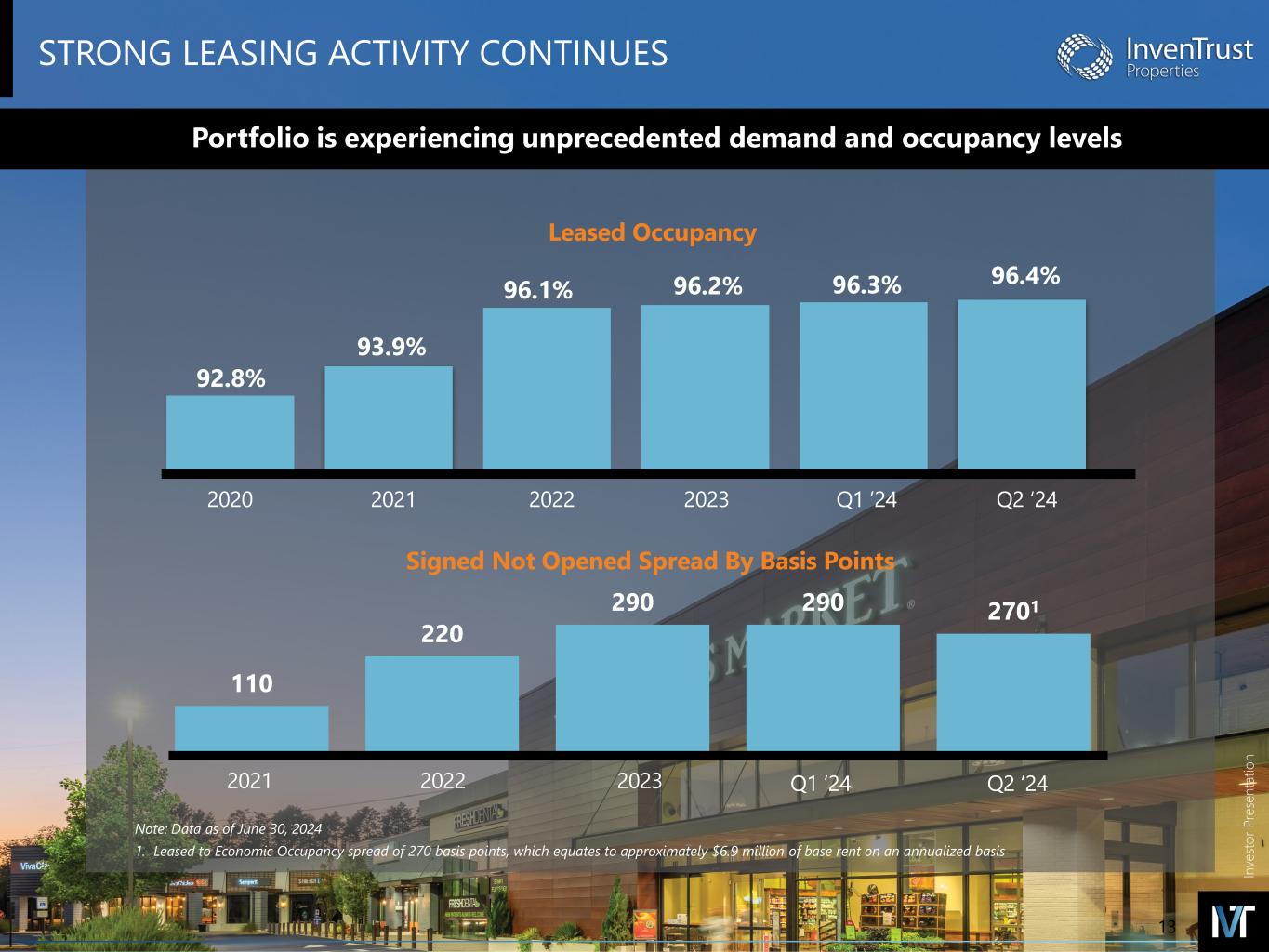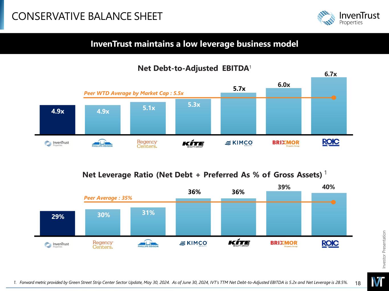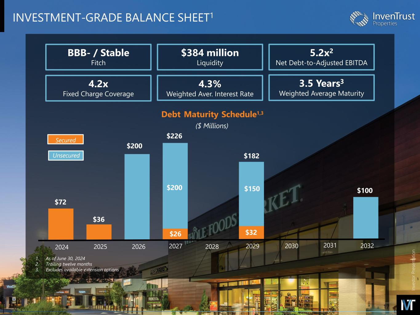 In ve sto r P re se nt at io n INTRODUCTORY NOTES FORWARD-LOOKING STATEMENTS DISCLAIMER Forward-Looking Statements in this presentation, which are not historical facts, are forward-looking statements within the meaning of the Private Securities Litigation Reform Act of 1995. Forward-looking statements, including statements about the Company's 2024 guidance or any updates to such guidance, our continued growth in Same Property NOI, the Company's flexible balance sheet, future capital allocation decisions and asset acquisitions, or regarding management’s intentions, beliefs, expectations, representations, plans or predictions of the future, are typically identified by words such as “may,” “could,” “expect,” “intend,” “plan,” “seek,” “anticipate,” “believe,” “estimate,” “predict,” “potential,” "continue," “likely,” “will,” “would,” "outlook,“ "guidance," and variations of these terms and similar expressions, or the negative of these terms or similar expressions. Such forward-looking statements are necessarily based upon estimates and assumptions that, while considered reasonable by the Company and its management, are inherently uncertain. The following factors, among others, could cause actual results, financial position and timing of certain events to differ materially from those described in the forward-looking statements: interest rate movements; local, regional, national and global economic performance; the impact of inflation on the Company and on its tenants; competitive factors; the impact of e-commerce on the retail industry; future retailer store closings; retailer consolidation; retailers reducing store size; retailer bankruptcies; government policy changes; and any material market changes and trends that could affect the Company’s business strategy. For further discussion of factors that could materially affect the outcome of management's forward-looking statements and IVT's future results and financial condition, see the Risk Factors included in the Company's most recent Annual Report on Form 10-K, as updated by any subsequent Quarterly Report on Form 10-Q, in each case as filed with the SEC. InvenTrust intends that such forward- looking statements be subject to the safe harbors created by Section 27A of the Securities Act of 1933, as amended, and Section 21E of the Securities Exchange Act of 1934, as amended, except as may be required by applicable law. IVT cautions you not to place undue reliance on any forward-looking statements, which are made as of the date of this supplemental. IVT undertakes no obligation to update publicly any of these forward-looking statements to reflect actual results, new information or future events, changes in assumptions or changes in other factors affecting forward-looking statements, except to the extent required by applicable laws. If IVT updates one or more forward-looking statements, no inference should be drawn that IVT will make additional updates with respect to those or other forward- looking statements. TRADEMARKS The companies depicted in the photographs herein, or any third-party trademarks, including names, logos and brands, referenced by the Company in this presentation, are the property of their respective owners. All references to third-party trademarks are for identification purposes only and nothing herein shall be considered to be an endorsement, authorization or approval of InvenTrust Properties Corp. by the companies. Further, none of these companies are affiliated with the Company in any manner. 2