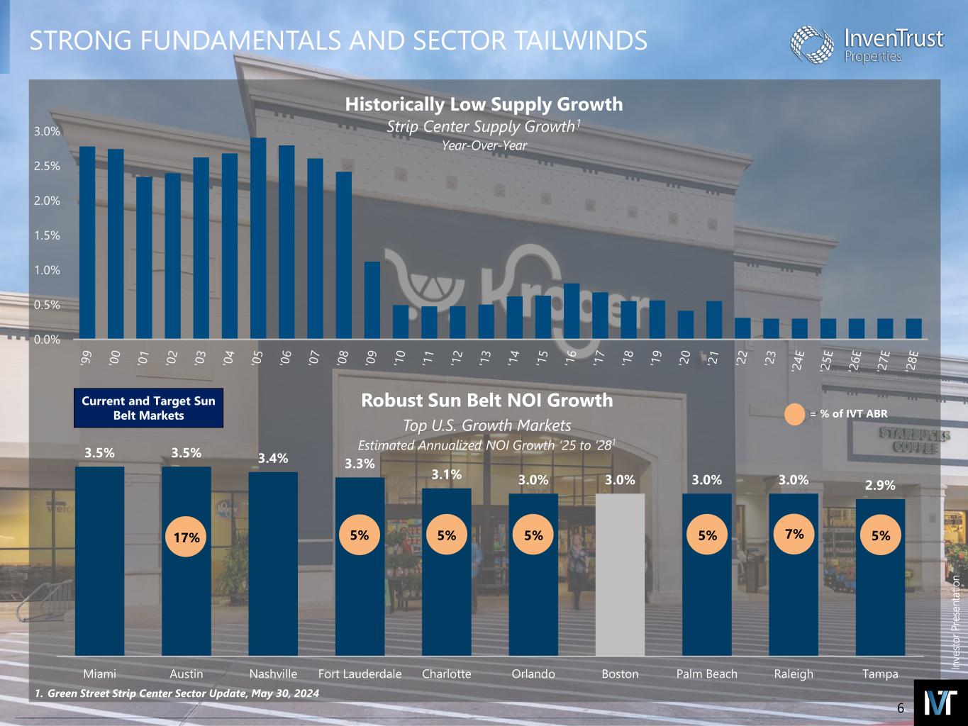 In ve sto r P re se nt at io n A SIMPLE AND FOCUSED INVESTMENT OPPORTUNITY High-Performing, Grocery- Anchored Portfolio • 87% of NOI derived from centers with a grocery presence • Long-term stable NOI growth • Essential retail tenants drive recurring foot traffic • Cycle-tested portfolio, providing durable cash flow Strong Balance Sheet with Investment Capacity • Investment-grade balance sheet with ample liquidity • Fitch rating BBB- / Stable outlook • Conservative leverage enables self-funded growth strategy • Limited and manageable debt maturities through ‘25 • Disciplined capital allocation approach Sun Belt Markets with Strong, Persistent Migration • Sector-leading Sun Belt concentration • Attractive demographic trends – jobs, population, education and household income • Long-term Sun Belt growth set to substantially outpace the national average Corporate Sustainability And Governance • GRESB participant since 2013 • Annual ESG report with five-year environmental reduction targets • Conducted first ESG materiality assessment • Shareholder friendly governance structure • Destaggered Board and opted out of MUTA Retail Sector Tailwinds • Minimal new supply dynamics well below historical averages expected to continue • Suburbanization and work from home trends • Tenant watch list is limited • Necessity-based, value-oriented tenants and quick- service restaurants continue to open locations 5