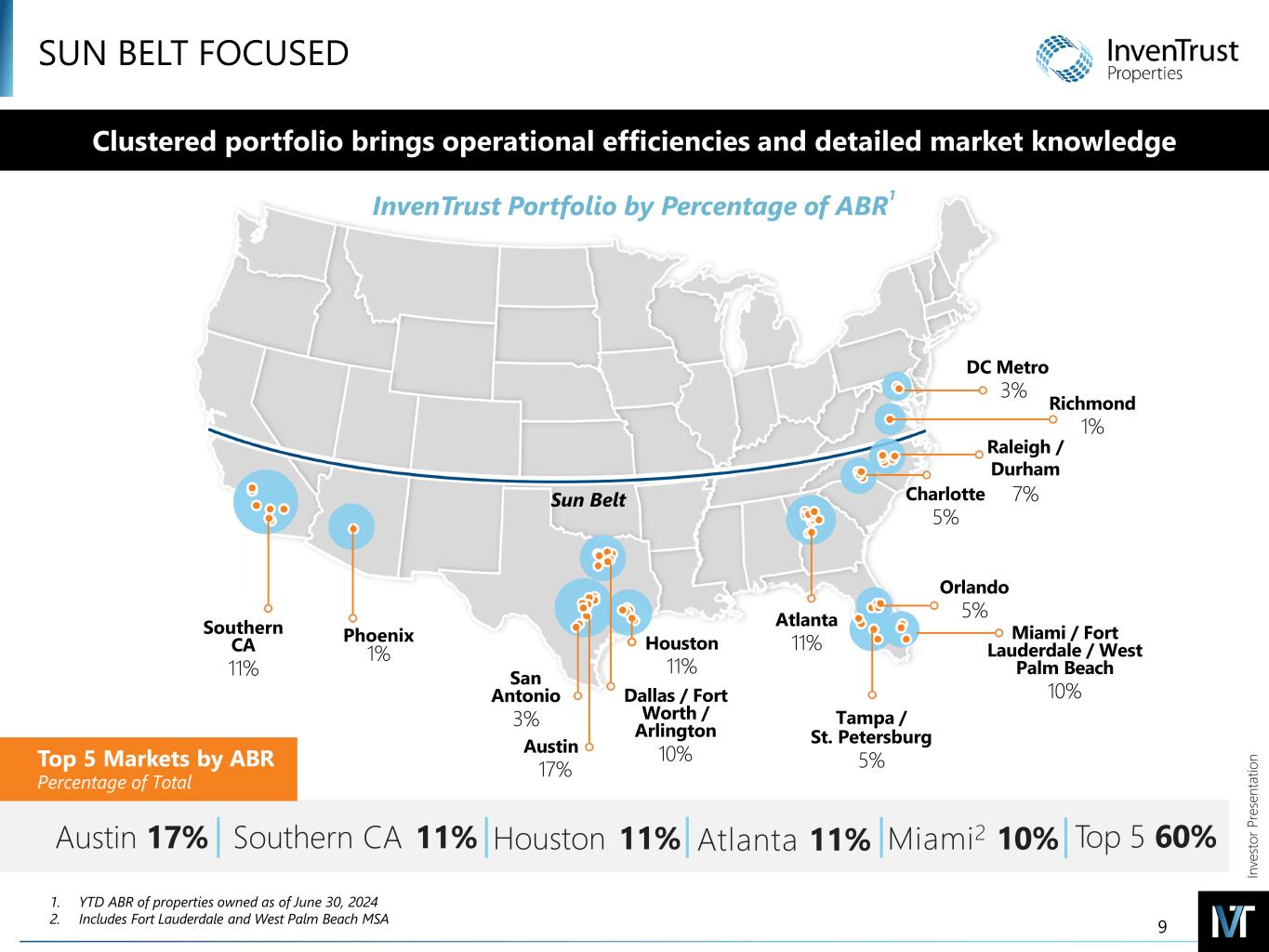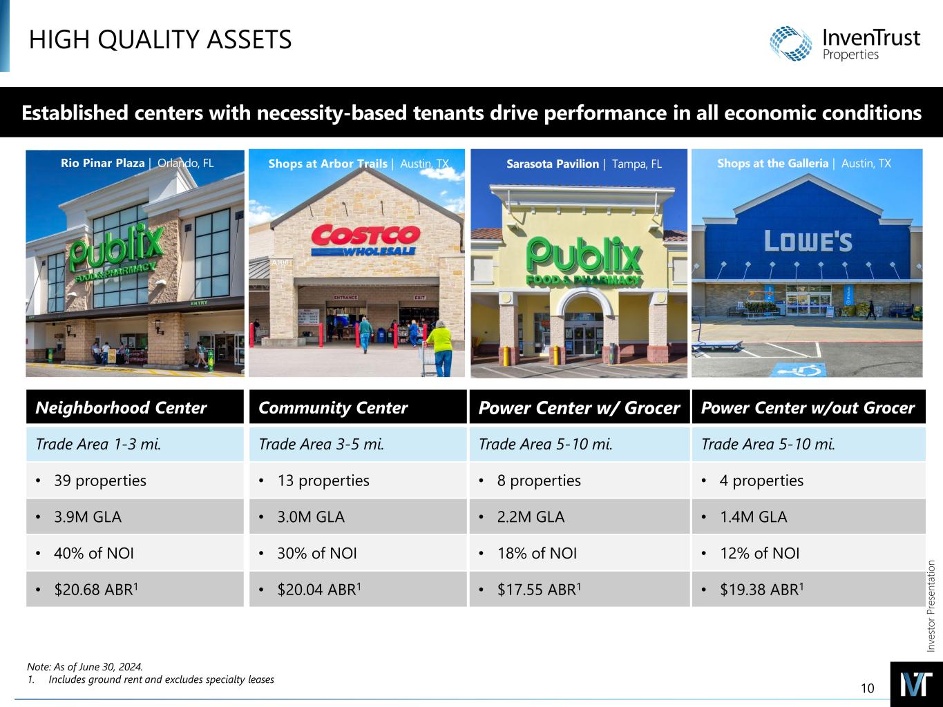 In ve sto r P re se nt at io n SUN BELT FOCUSED Established centers with necessity-based tenants drive performance in all economic conditions Clustered portfolio brings operational efficiencies and detailed market knowledge 9 Southern CA 11% San Antonio 3% Austin 17% Dallas / Fort Worth / Arlington 10% Houston 11% Atlanta 11% Tampa / St. Petersburg 5% Miami / Fort Lauderdale / West Palm Beach 10% Orlando 5% Charlotte 5% Raleigh / Durham 7% DC Metro 3% Richmond 1% Phoenix 1% InvenTrust Portfolio by Percentage of ABR1 Houston 11% Atlanta 11% Top 5 60%Austin 17% Southern CA 11% Top 5 Markets by ABR Percentage of Total 1. YTD ABR of properties owned as of June 30, 2024 2. Includes Fort Lauderdale and West Palm Beach MSA Sun Belt Miami2 10%