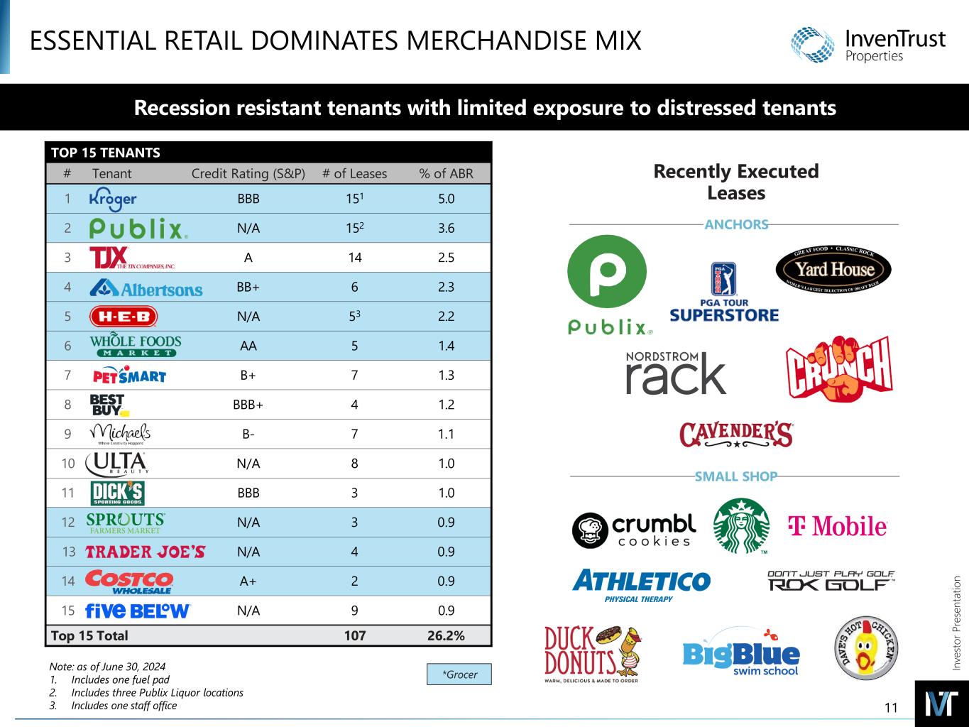 In ve sto r P re se nt at io n Neighborhood Center Trade Area 1-3 mi. • 39 properties • 3.9M GLA • 40% of NOI • $20.68 ABR1 Community Center Trade Area 3-5 mi. • 13 properties • 3.0M GLA • 30% of NOI • $20.04 ABR1 Power Center w/ Grocer Trade Area 5-10 mi. • 8 properties • 2.2M GLA • 18% of NOI • $17.55 ABR1 Power Center w/out Grocer Trade Area 5-10 mi. • 4 properties • 1.4M GLA • 12% of NOI • $19.38 ABR1 HIGH QUALITY ASSETS Rio Pinar Plaza | Orlando, FL Shops at the Galleria | Austin, TXSarasota Pavilion | Tampa, FLShops at Arbor Trails | Austin, TX Established centers with necessity-based tenants drive performance in all economic conditions Established centers with necessity-based tenants drive performance in all economic conditions Note: As of June 30, 2024. 1. Includes ground rent and excludes specialty leases 10