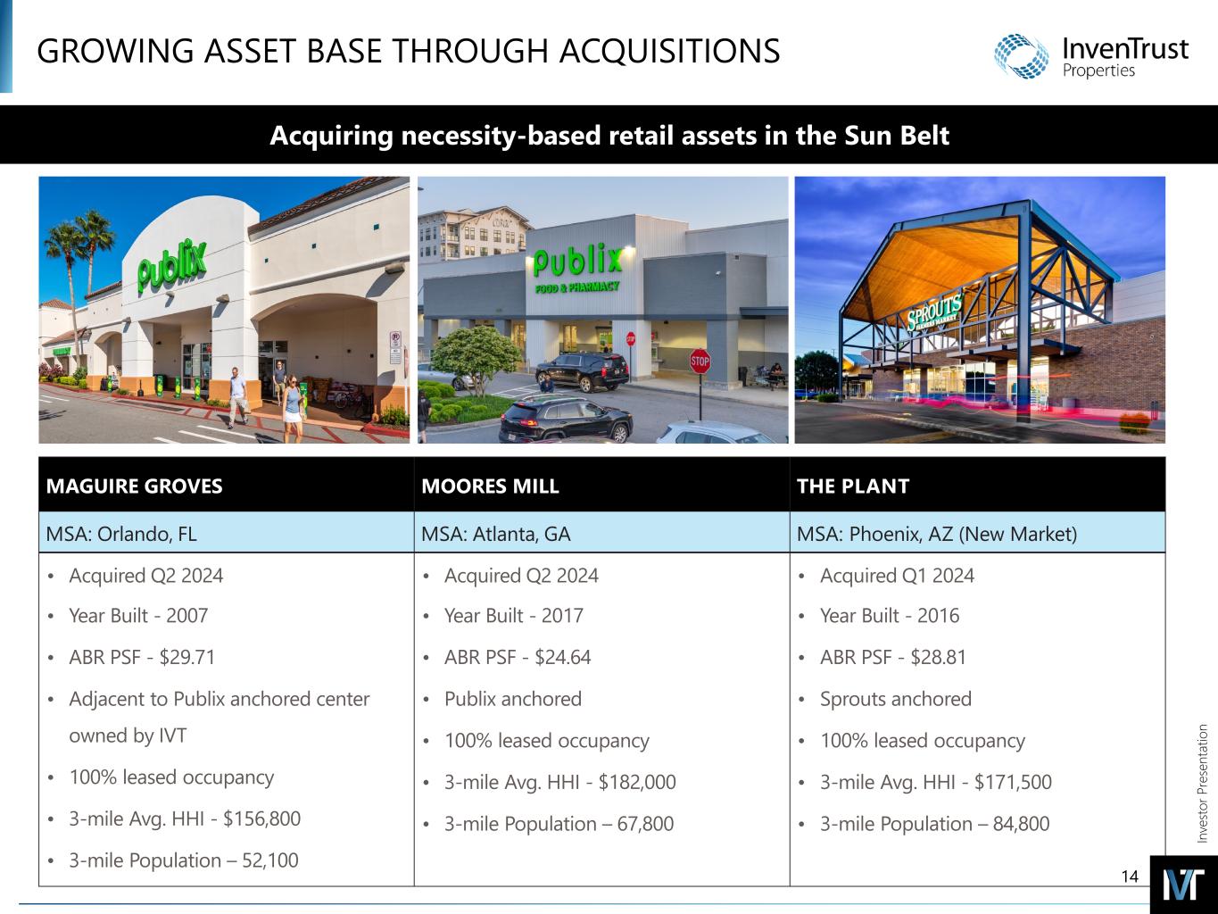 In ve sto r P re se nt at io n GROWING ASSET BASE THROUGH ACQUISITIONS Established centers with necessity-based tenants drive performance in all economic conditions Acquiring necessity-based retail assets in the Sun Belt MAGUIRE GROVES MOORES MILL THE PLANT MSA: Orlando, FL MSA: Atlanta, GA MSA: Phoenix, AZ (New Market) • Acquired Q2 2024 • Year Built - 2007 • ABR PSF - $29.71 • Adjacent to Publix anchored center owned by IVT • 100% leased occupancy • 3-mile Avg. HHI - $156,800 • 3-mile Population – 52,100 • Acquired Q2 2024 • Year Built - 2017 • ABR PSF - $24.64 • Publix anchored • 100% leased occupancy • 3-mile Avg. HHI - $182,000 • 3-mile Population – 67,800 • Acquired Q1 2024 • Year Built - 2016 • ABR PSF - $28.81 • Sprouts anchored • 100% leased occupancy • 3-mile Avg. HHI - $171,500 • 3-mile Population – 84,800 14