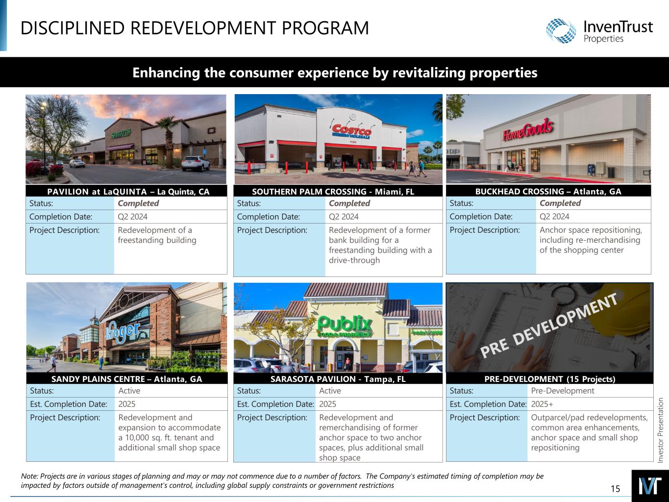 In ve sto r P re se nt at io n DISCIPLINED REDEVELOPMENT PROGRAM Enhancing the consumer experience by revitalizing properties SOUTHERN PALM CROSSING - Miami, FL Status: Completed Completion Date: Q2 2024 Project Description: Redevelopment of a former bank building for a freestanding building with a drive-through PAVILION at LaQUINTA – La Quinta, CA Status: Completed Completion Date: Q2 2024 Project Description: Redevelopment of a freestanding building BUCKHEAD CROSSING – Atlanta, GA Status: Completed Completion Date: Q2 2024 Project Description: Anchor space repositioning, including re-merchandising of the shopping center SANDY PLAINS CENTRE – Atlanta, GA Status: Active Est. Completion Date: 2025 Project Description: Redevelopment and expansion to accommodate a 10,000 sq. ft. tenant and additional small shop space SARASOTA PAVILION - Tampa, FL Status: Active Est. Completion Date: 2025 Project Description: Redevelopment and remerchandising of former anchor space to two anchor spaces, plus additional small shop space PRE-DEVELOPMENT (15 Projects) Status: Pre-Development Est. Completion Date: 2025+ Project Description: Outparcel/pad redevelopments, common area enhancements, anchor space and small shop repositioning Note: Projects are in various stages of planning and may or may not commence due to a number of factors. The Company's estimated timing of completion may be impacted by factors outside of management's control, including global supply constraints or government restrictions 15