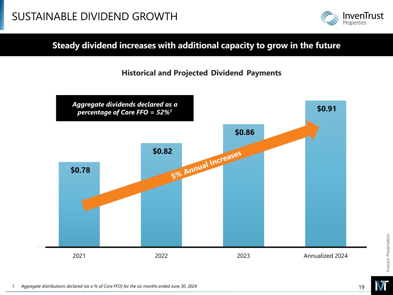 In ve sto r P re se nt at io n CONSERVATIVE BALANCE SHEET Net Leverage Ratio (Net Debt + Preferred As % of Gross Assets) 1 Peer Average : 35% 30% 31% 36% 39% 40% InvenTrust maintains a low leverage business model Net Debt-to-Adjusted EBITDA1 4.9x 5.1x 5.3x 5.7x 6.0x 6.7x Peer WTD Average by Market Cap : 5.5x 4.9x 29% 36% 1. Forward metric provided by Green Street Strip Center Sector Update, May 30, 2024. As of June 30, 2024, IVT’s TTM Net Debt-to-Adjusted EBITDA is 5.2x and Net Leverage is 28.5%. 18