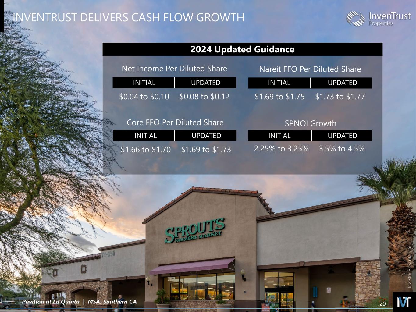 In ve sto r P re se nt at io n INVENTRUST DELIVERS CASH FLOW GROWTH Net Income Per Diluted Share $0.08 to $0.12 UPDATED Nareit FFO Per Diluted Share Core FFO Per Diluted Share SPNOI Growth 2024 Updated Guidance $0.04 to $0.10 INITIAL $1.73 to $1.77 UPDATED $1.69 to $1.75 INITIAL $1.69 to $1.73 UPDATED $1.66 to $1.70 INITIAL 3.5% to 4.5% UPDATED 2.25% to 3.25% INITIAL Pavilion at La Quinta | MSA: Southern CA 20