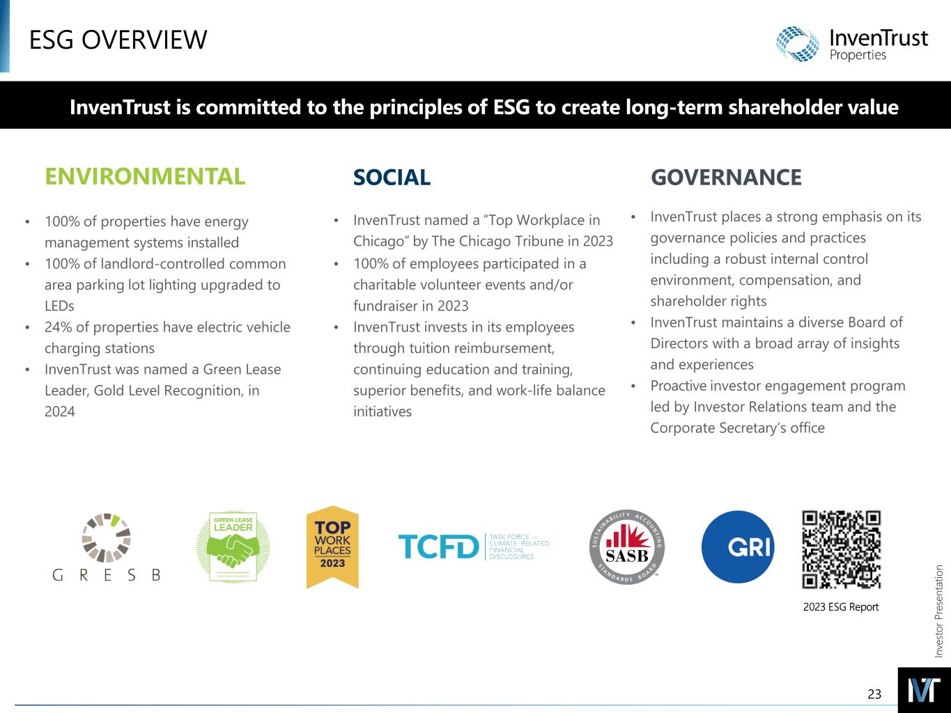 In ve sto r P re se nt at io n ESG OVERVIEW 23 • 100% of properties have energy management systems installed • 100% of landlord-controlled common area parking lot lighting upgraded to LEDs • 24% of properties have electric vehicle charging stations • InvenTrust was named a Green Lease Leader, Gold Level Recognition, in 2024 SOCIAL GOVERNANCE • InvenTrust places a strong emphasis on its governance policies and practices including a robust internal control environment, compensation, and shareholder rights • InvenTrust maintains a diverse Board of Directors with a broad array of insights and experiences • Proactive investor engagement program led by Investor Relations team and the Corporate Secretary’s office ENVIRONMENTAL • InvenTrust named a “Top Workplace in Chicago” by The Chicago Tribune in 2023 • 100% of employees participated in a charitable volunteer events and/or fundraiser in 2023 • InvenTrust invests in its employees through tuition reimbursement, continuing education and training, superior benefits, and work-life balance initiatives InvenTrust is committed to the principles of ESG to create long-term shareholder value 2023 ESG Report