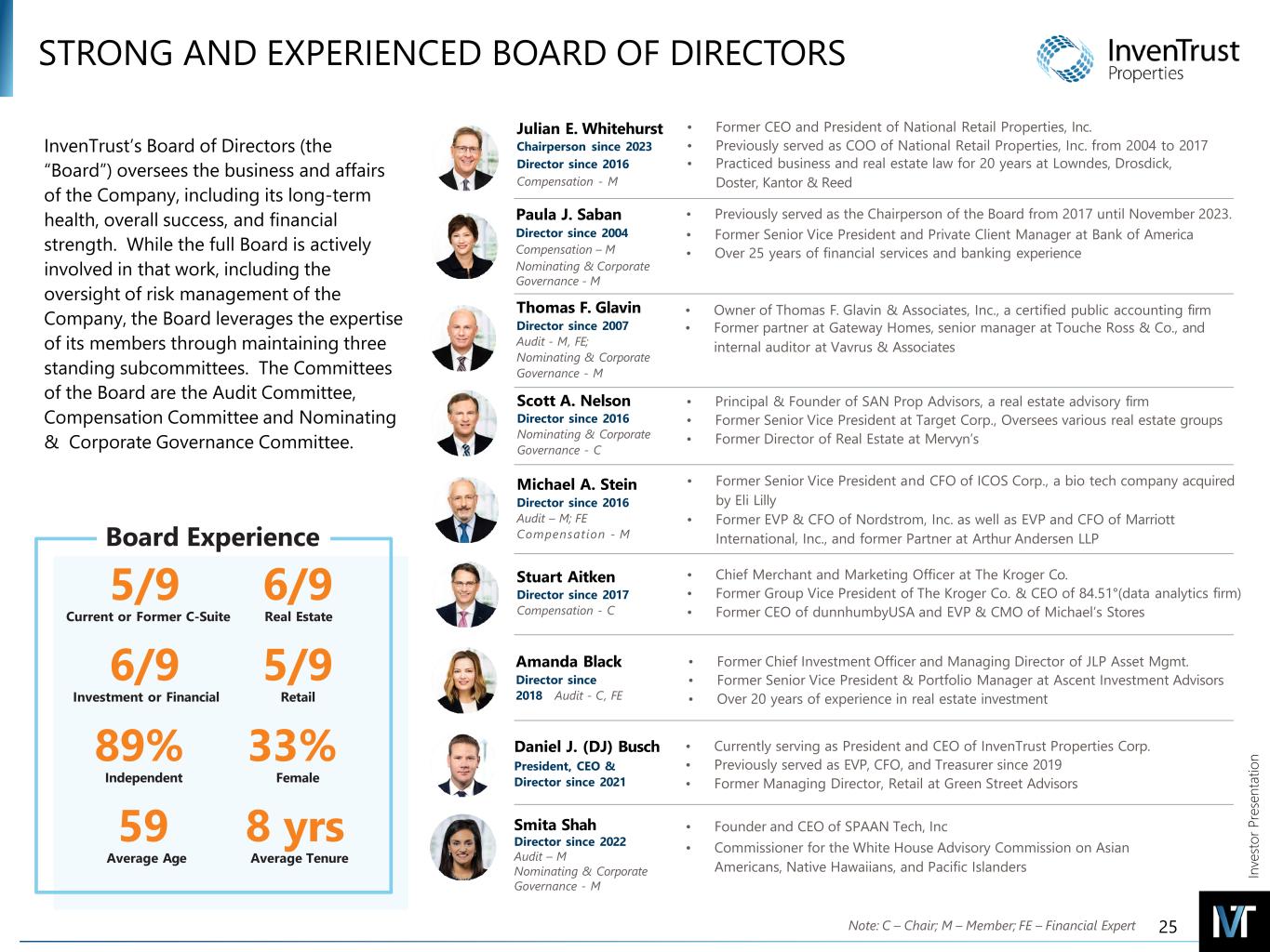 In ve sto r P re se nt at io n STRONG AND EXPERIENCED BOARD OF DIRECTORS Paula J. Saban Director since 2004 Compensation – M Nominating & Corporate Governance - M • Previously served as the Chairperson of the Board from 2017 until November 2023. • Former Senior Vice President and Private Client Manager at Bank of America • Over 25 years of financial services and banking experience Thomas F. Glavin Director since 2007 Audit - M, FE; Nominating & Corporate Governance - M • Owner of Thomas F. Glavin & Associates, Inc., a certified public accounting firm • Former partner at Gateway Homes, senior manager at Touche Ross & Co., and internal auditor at Vavrus & Associates Scott A. Nelson Director since 2016 Nominating & Corporate Governance - C • Principal & Founder of SAN Prop Advisors, a real estate advisory firm • Former Senior Vice President at Target Corp., Oversees various real estate groups • Former Director of Real Estate at Mervyn’s Amanda Black Director since 2018 Audit - C, FE • Former Chief Investment Officer and Managing Director of JLP Asset Mgmt. • Former Senior Vice President & Portfolio Manager at Ascent Investment Advisors • Over 20 years of experience in real estate investment Stuart Aitken Director since 2017 Compensation - C • Chief Merchant and Marketing Officer at The Kroger Co. • Former Group Vice President of The Kroger Co. & CEO of 84.51°(data analytics firm) • Former CEO of dunnhumbyUSA and EVP & CMO of Michael’s Stores Daniel J. (DJ) Busch President, CEO & Director since 2021 • Currently serving as President and CEO of InvenTrust Properties Corp. • Previously served as EVP, CFO, and Treasurer since 2019 • Former Managing Director, Retail at Green Street Advisors Julian E. Whitehurst Chairperson since 2023 Director since 2016 Compensation - M • Former CEO and President of National Retail Properties, Inc. • Previously served as COO of National Retail Properties, Inc. from 2004 to 2017 • Practiced business and real estate law for 20 years at Lowndes, Drosdick, Doster, Kantor & Reed Michael A. Stein Director since 2016 Audit – M; FE Compensation - M • Former Senior Vice President and CFO of ICOS Corp., a bio tech company acquired by Eli Lilly • Former EVP & CFO of Nordstrom, Inc. as well as EVP and CFO of Marriott International, Inc., and former Partner at Arthur Andersen LLP Smita Shah Director since 2022 Audit – M Nominating & Corporate Governance - M 6/9 5/9 Investment or Financial Retail 5/9 6/9 Current or Former C-Suite Real Estate 89% 33% Independent Female 59 8 yrs Average Age Average Tenure Board Experience Note: C – Chair; M – Member; FE – Financial Expert • Founder and CEO of SPAAN Tech, Inc • Commissioner for the White House Advisory Commission on Asian Americans, Native Hawaiians, and Pacific Islanders InvenTrust’s Board of Directors (the “Board”) oversees the business and affairs of the Company, including its long-term health, overall success, and financial strength. While the full Board is actively involved in that work, including the oversight of risk management of the Company, the Board leverages the expertise of its members through maintaining three standing subcommittees. The Committees of the Board are the Audit Committee, Compensation Committee and Nominating & Corporate Governance Committee. 25