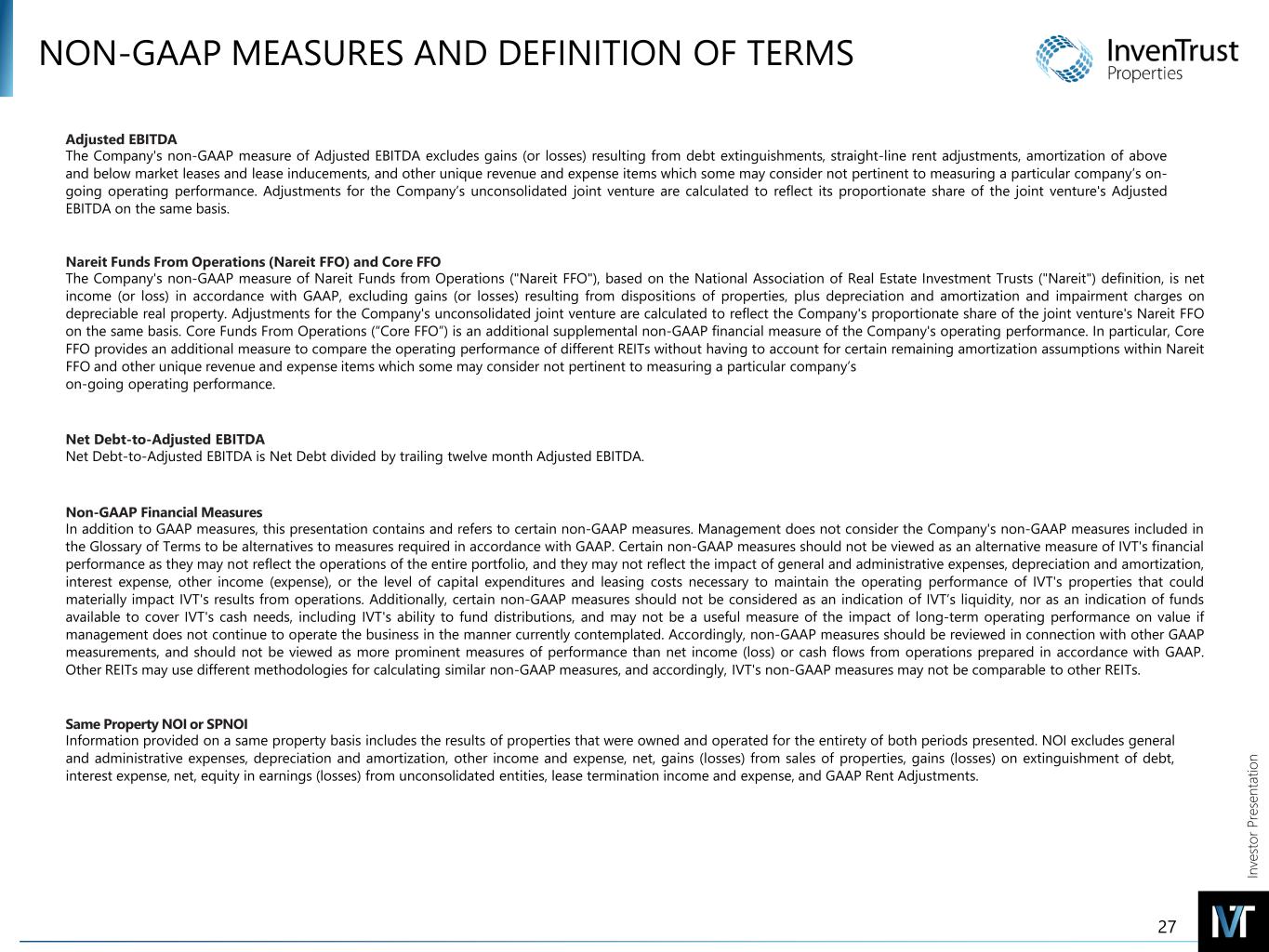In ve sto r P re se nt at io n NON-GAAP MEASURES AND DEFINITION OF TERMS Adjusted EBITDA The Company's non-GAAP measure of Adjusted EBITDA excludes gains (or losses) resulting from debt extinguishments, straight-line rent adjustments, amortization of above and below market leases and lease inducements, and other unique revenue and expense items which some may consider not pertinent to measuring a particular company’s on- going operating performance. Adjustments for the Company’s unconsolidated joint venture are calculated to reflect its proportionate share of the joint venture's Adjusted EBITDA on the same basis. Nareit Funds From Operations (Nareit FFO) and Core FFO The Company's non-GAAP measure of Nareit Funds from Operations ("Nareit FFO"), based on the National Association of Real Estate Investment Trusts ("Nareit") definition, is net income (or loss) in accordance with GAAP, excluding gains (or losses) resulting from dispositions of properties, plus depreciation and amortization and impairment charges on depreciable real property. Adjustments for the Company's unconsolidated joint venture are calculated to reflect the Company's proportionate share of the joint venture's Nareit FFO on the same basis. Core Funds From Operations (“Core FFO”) is an additional supplemental non-GAAP financial measure of the Company's operating performance. In particular, Core FFO provides an additional measure to compare the operating performance of different REITs without having to account for certain remaining amortization assumptions within Nareit FFO and other unique revenue and expense items which some may consider not pertinent to measuring a particular company’s on-going operating performance. Net Debt-to-Adjusted EBITDA Net Debt-to-Adjusted EBITDA is Net Debt divided by trailing twelve month Adjusted EBITDA. Non-GAAP Financial Measures In addition to GAAP measures, this presentation contains and refers to certain non-GAAP measures. Management does not consider the Company's non-GAAP measures included in the Glossary of Terms to be alternatives to measures required in accordance with GAAP. Certain non-GAAP measures should not be viewed as an alternative measure of IVT's financial performance as they may not reflect the operations of the entire portfolio, and they may not reflect the impact of general and administrative expenses, depreciation and amortization, interest expense, other income (expense), or the level of capital expenditures and leasing costs necessary to maintain the operating performance of IVT's properties that could materially impact IVT's results from operations. Additionally, certain non-GAAP measures should not be considered as an indication of IVT’s liquidity, nor as an indication of funds available to cover IVT's cash needs, including IVT's ability to fund distributions, and may not be a useful measure of the impact of long-term operating performance on value if management does not continue to operate the business in the manner currently contemplated. Accordingly, non-GAAP measures should be reviewed in connection with other GAAP measurements, and should not be viewed as more prominent measures of performance than net income (loss) or cash flows from operations prepared in accordance with GAAP. Other REITs may use different methodologies for calculating similar non-GAAP measures, and accordingly, IVT's non-GAAP measures may not be comparable to other REITs. Same Property NOI or SPNOI Information provided on a same property basis includes the results of properties that were owned and operated for the entirety of both periods presented. NOI excludes general and administrative expenses, depreciation and amortization, other income and expense, net, gains (losses) from sales of properties, gains (losses) on extinguishment of debt, interest expense, net, equity in earnings (losses) from unconsolidated entities, lease termination income and expense, and GAAP Rent Adjustments. 27