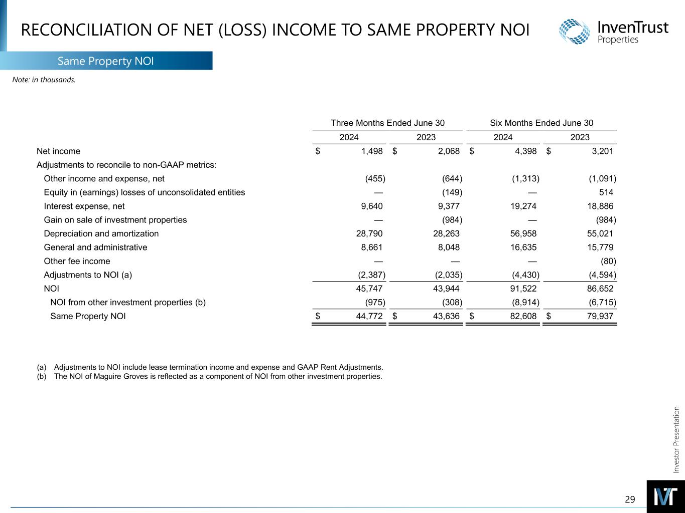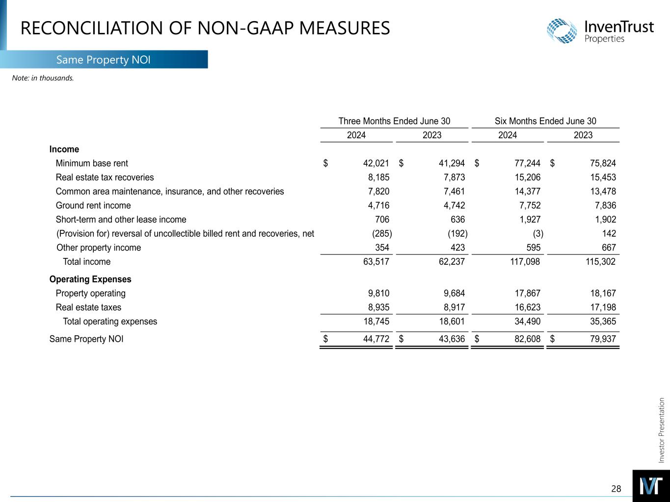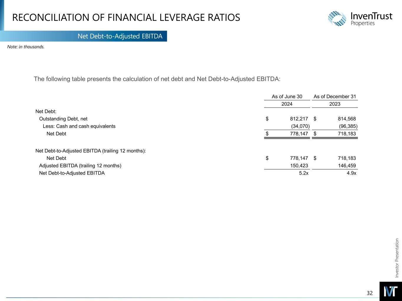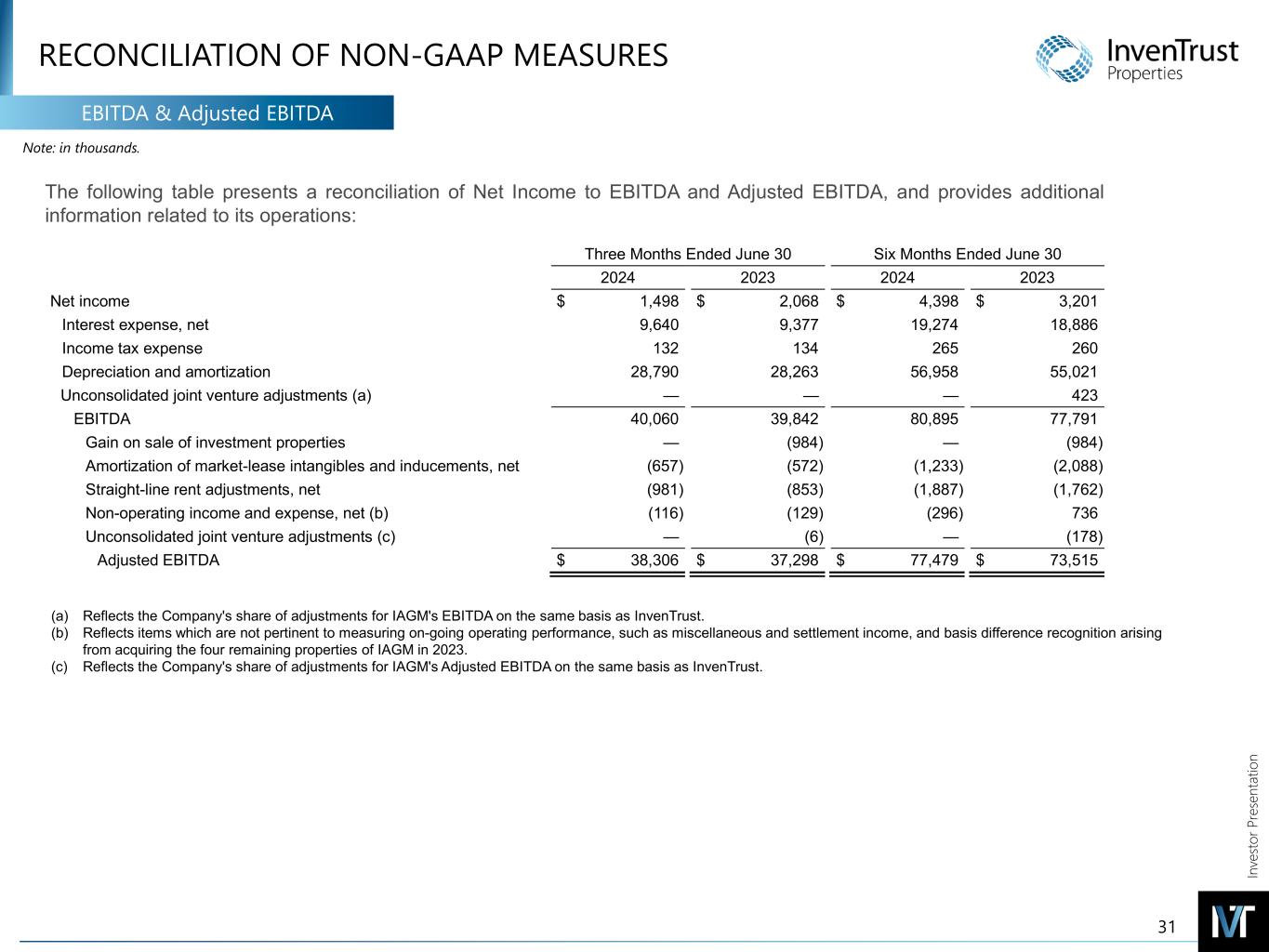 In ve sto r P re se nt at io n RECONCILIATION OF NON-GAAP MEASURES EBITDA & Adjusted EBITDA EBITDANote: in thousands. (a) Reflects the Company's share of adjustments for IAGM's EBITDA on the same basis as InvenTrust. (b) Reflects items which are not pertinent to measuring on-going operating performance, such as miscellaneous and settlement income, and basis difference recognition arising from acquiring the four remaining properties of IAGM in 2023. (c) Reflects the Company's share of adjustments for IAGM's Adjusted EBITDA on the same basis as InvenTrust. 31 The following table presents a reconciliation of Net Income to EBITDA and Adjusted EBITDA, and provides additional information related to its operations: Three Months Ended June 30 Six Months Ended June 30 2024 2023 2024 2023 Net income $ 1,498 $ 2,068 $ 4,398 $ 3,201 Interest expense, net 9,640 9,377 19,274 18,886 Income tax expense 132 134 265 260 Depreciation and amortization 28,790 28,263 56,958 55,021 Unconsolidated joint venture adjustments (a) — — — 423 EBITDA 40,060 39,842 80,895 77,791 Gain on sale of investment properties — (984) — (984) Amortization of market-lease intangibles and inducements, net (657) (572) (1,233) (2,088) Straight-line rent adjustments, net (981) (853) (1,887) (1,762) Non-operating income and expense, net (b) (116) (129) (296) 736 Unconsolidated joint venture adjustments (c) — (6) — (178) Adjusted EBITDA $ 38,306 $ 37,298 $ 77,479 $ 73,515