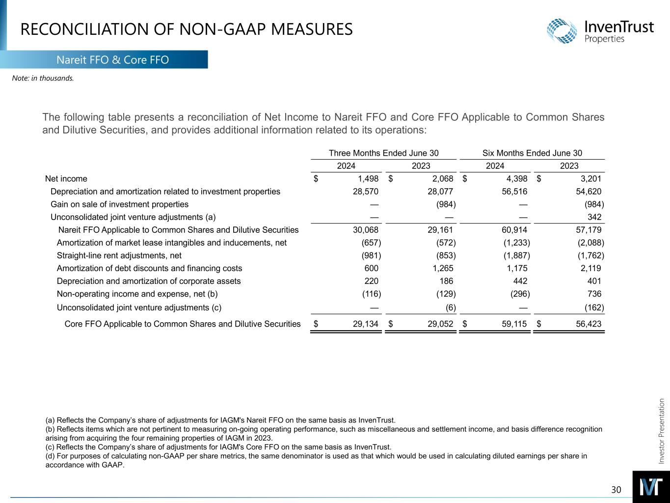 In ve sto r P re se nt at io n RECONCILIATION OF NON-GAAP MEASURES Nareit FFO & Core FFO Note: in thousands. 30 (a) Reflects the Company’s share of adjustments for IAGM's Nareit FFO on the same basis as InvenTrust. (b) Reflects items which are not pertinent to measuring on-going operating performance, such as miscellaneous and settlement income, and basis difference recognition arising from acquiring the four remaining properties of IAGM in 2023. (c) Reflects the Company’s share of adjustments for IAGM's Core FFO on the same basis as InvenTrust. (d) For purposes of calculating non-GAAP per share metrics, the same denominator is used as that which would be used in calculating diluted earnings per share in accordance with GAAP. The following table presents a reconciliation of Net Income to Nareit FFO and Core FFO Applicable to Common Shares and Dilutive Securities, and provides additional information related to its operations: Three Months Ended June 30 Six Months Ended June 30 2024 2023 2024 2023 Net income $ 1,498 $ 2,068 $ 4,398 $ 3,201 Depreciation and amortization related to investment properties 28,570 28,077 56,516 54,620 Gain on sale of investment properties — (984) — (984) Unconsolidated joint venture adjustments (a) — — — 342 Nareit FFO Applicable to Common Shares and Dilutive Securities 30,068 29,161 60,914 57,179 Amortization of market lease intangibles and inducements, net (657) (572) (1,233) (2,088) Straight-line rent adjustments, net (981) (853) (1,887) (1,762) Amortization of debt discounts and financing costs 600 1,265 1,175 2,119 Depreciation and amortization of corporate assets 220 186 442 401 Non-operating income and expense, net (b) (116) (129) (296) 736 Unconsolidated joint venture adjustments (c) — (6) — (162) Core FFO Applicable to Common Shares and Dilutive Securities $ 29,134 $ 29,052 $ 59,115 $ 56,423