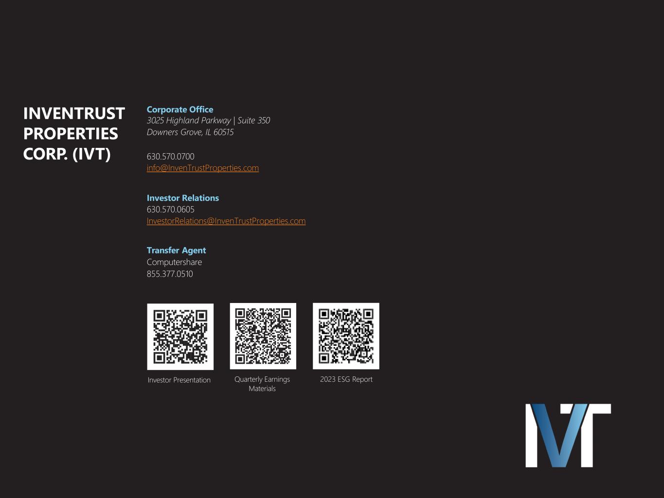 INVENTRUST PROPERTIES CORP. (IVT) Investor Presentation Quarterly Earnings Materials 2023 ESG Report Corporate Office 3025 Highland Parkway | Suite 350 Downers Grove, IL 60515 630.570.0700 info@InvenTrustProperties.com Investor Relations 630.570.0605 InvestorRelations@InvenTrustProperties.com Transfer Agent Computershare 855.377.0510
