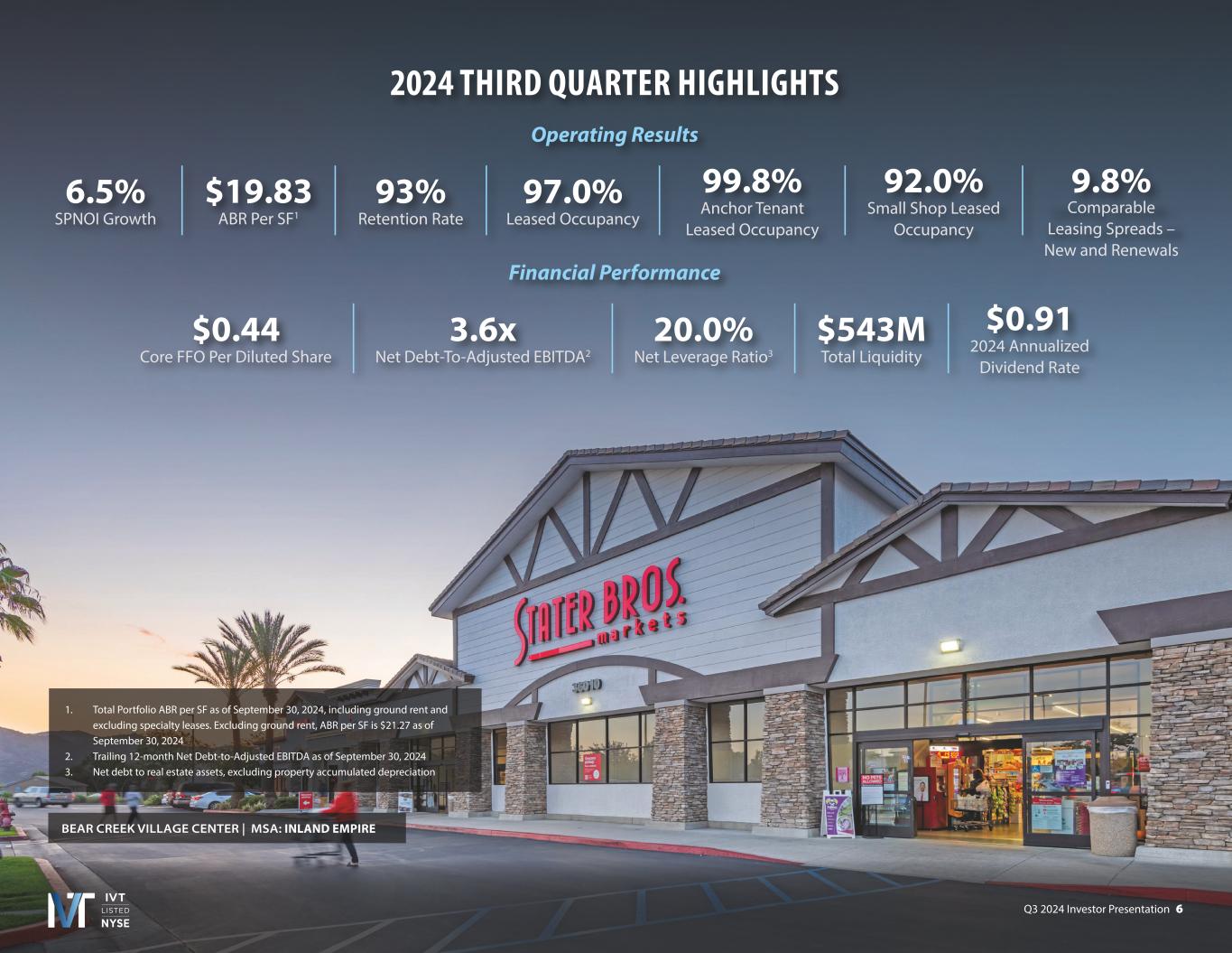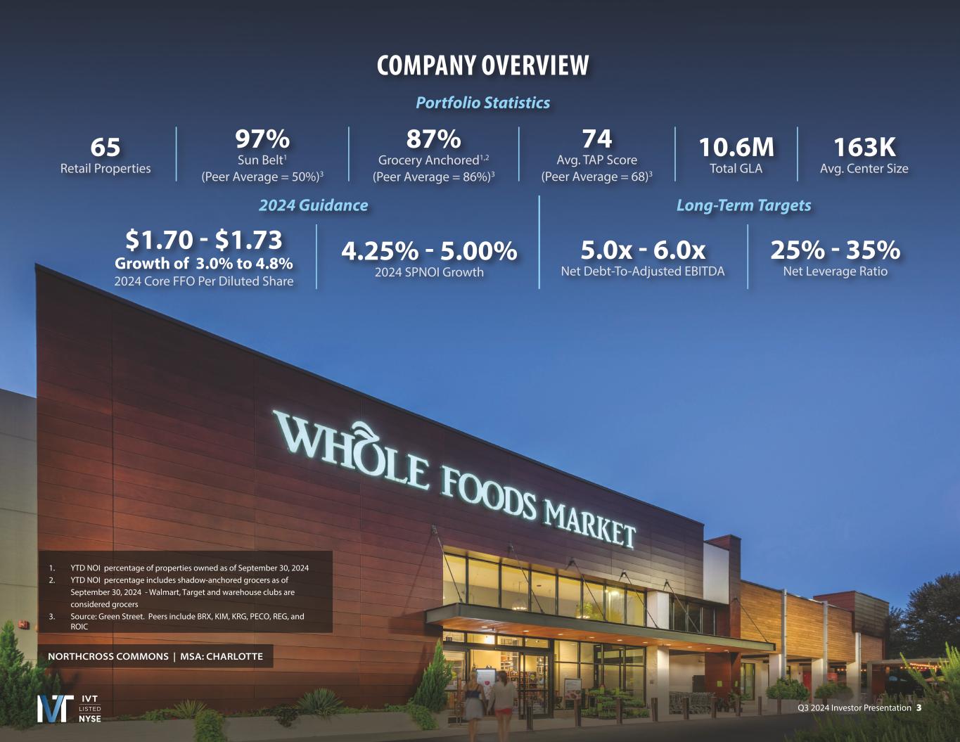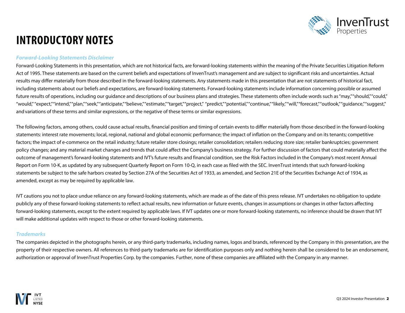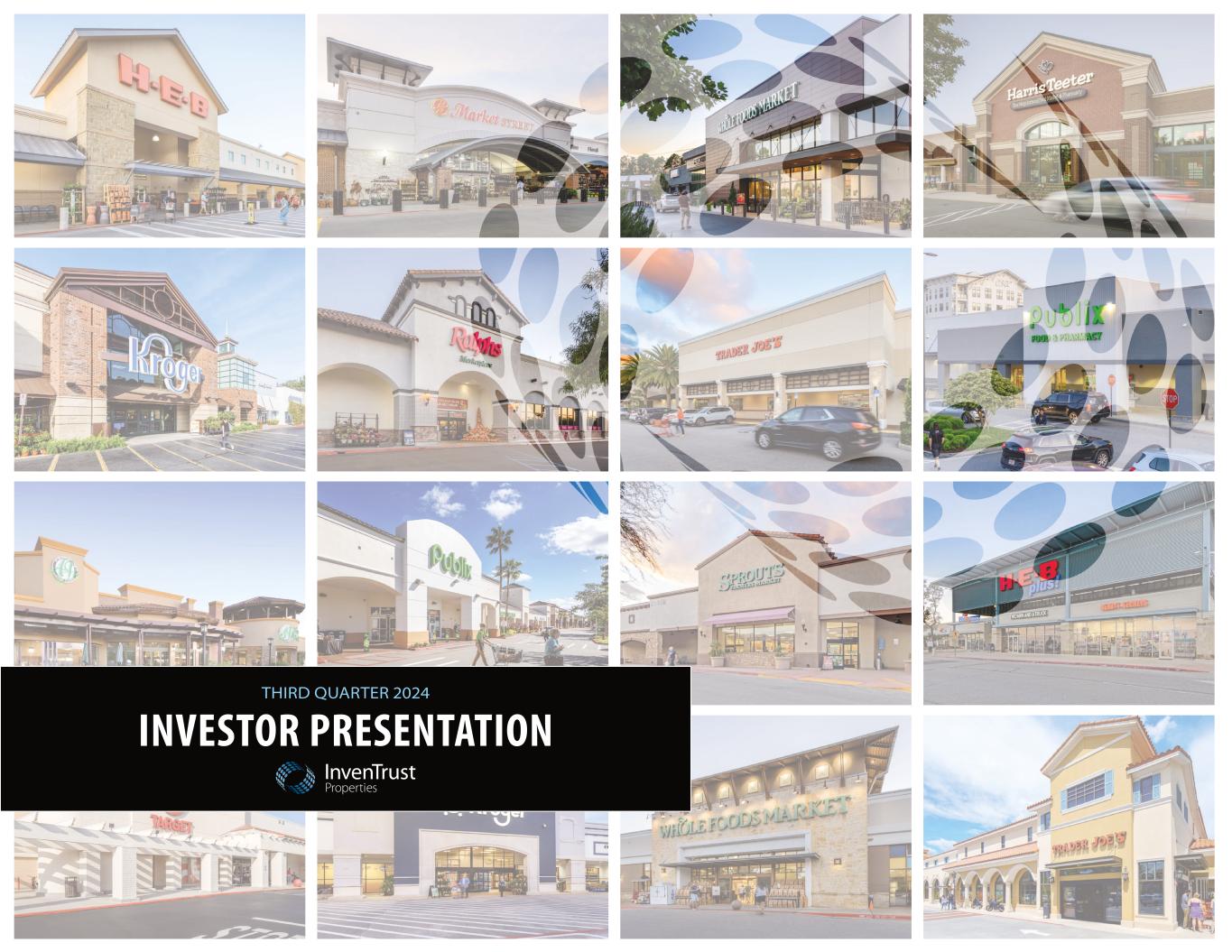 Q3 2024 Investor Presentation 2 INTRODUCTORY NOTES Forward-Looking Statements Disclaimer Forward-Looking Statements in this presentation, which are not historical facts, are forward-looking statements within the meaning of the Private Securities Litigation Reform Act of 1995. These statements are based on the current beliefs and expectations of InvenTrust’s management and are subject to significant risks and uncertainties. Actual results may differ materially from those described in the forward-looking statements. Any statements made in this pre that are not statements of historical fact, including statements about our beliefs and expectations, are forward-looking statements. Forward-looking statements include information concerning possible or assumed future results of operations, including our guidance and descriptions of our business plans and strategies. These statements often include words such as “may,” “should,” “could,” “would,” “expect,” “intend,” “plan,” “seek,” “anticipate,” “believe,” “estimate,” “target,” “project,” “predict,” “potential,” “continue,” “likely,” “will,” “forecast,” “outlook,” “guidance,” “suggest,” and variations of these terms and similar expressions, or the negative of these terms or similar expressions. The following factors, among others, could cause actual results, financial position and timing of certain events to differ materially from those described in the forward-looking statements: interest rate movements; local, regional, national and global economic performance; the impact of inflation on the Company and on its tenants; competitive factors; the impact of e-commerce on the retail industry; future retailer store closings; retailer consolidation; retailers reducing store size; retailer bankruptcies; government policy changes; and any material market changes and trends that could affect the Company’s business strategy. For further discussion of factors that could materially affect the outcome of management’s forward-looking statements and IVT’s future results and financial condition, see the Risk Factors included in the Company’s most recent Annual Report on Form 10-K, as updated by any subsequent Quarterly Report on Form 10-Q, in each case as filed with the SEC. InvenTrust intends that such forward-looking statements be subject to the safe harbors created by Section 27A of the Securities Act of 1933, as amended, and Section 21E of the Securities Exchange Act of 1934, as amended, except as may be required by applicable law. IVT cautions you not to place undue reliance on any forward-looking statements, which are made as of the date of this press release. IVT undertakes no obligation to update publicly any of these forward-looking statements to reflect actual results, new information or future events, changes in assumptions or changes in other factors affecting forward-looking statements, except to the extent required by applicable laws. If IVT updates one or more forward-looking statements, no inference should be drawn that IVT will make additional updates with respect to those or other forward-looking statements. Trademarks The companies depicted in the photographs herein, or any third-party trademarks, including names, logos and brands, referenced by the Company in this presentation, are the property of their respective owners. All references to third-party trademarks are for identification purposes only and nothing herein shall be considered to be an endorsement, authorization or approval of InvenTrust Properties Corp. by the companies. Further, none of these companies are affiliated with the Company in any manner.
