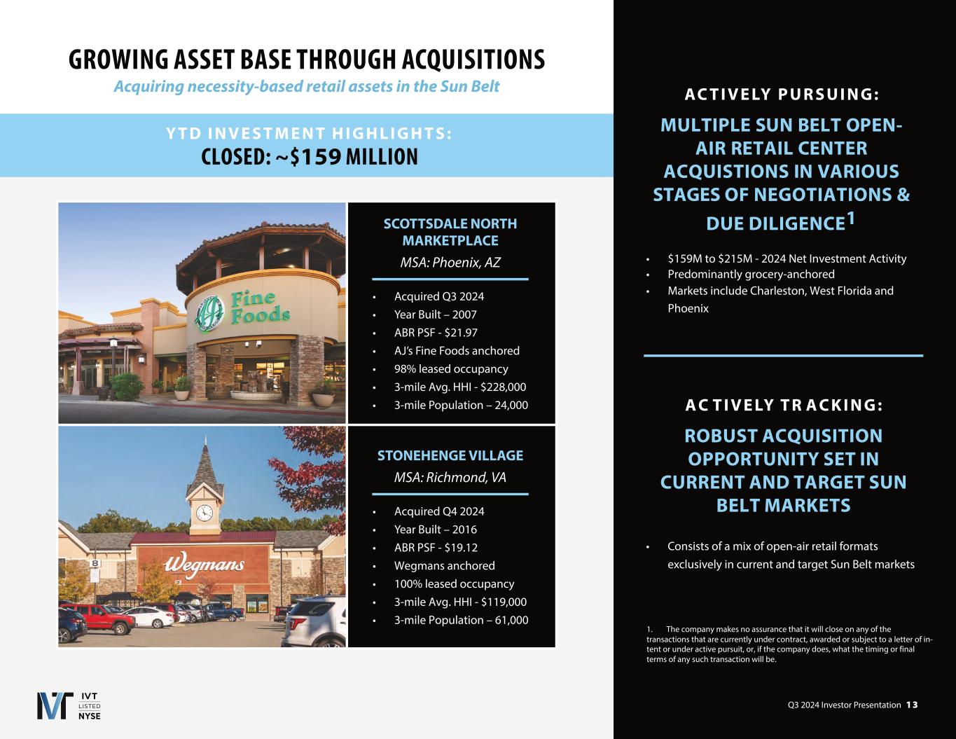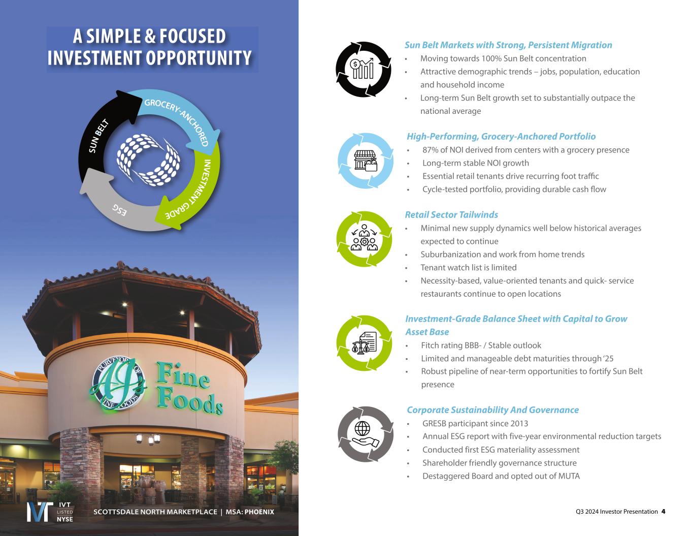 Q3 2024 Investor Presentation 1 3 GROWING ASSET BASE THROUGH ACQUISITIONS Acquiring necessity-based retail assets in the Sun Belt AC T I V E LY P U R S U I N G : • • Predominantly grocer anchored • Markets include Charleston, West Florida and • Consists of a mix of open-air retail formats exclusively in current and target Sun Belt markets A C T I V E LY T R A C K I N G 1. make no assurance that will close on any of the transactions • Acquired Q 2024 • Year Built – 2016 • ABR PSF - $19.12 • Wegmans anchored • 100% leased occupancy • 3-mile Avg. HHI - $119,000 • 3-mile Population – 61,000 STONEHENGE VILLAGE MSA: Richmond, VA • Acquired Q3 2024 • Year Built – 2007 • ABR PSF - $21.97 • AJ’s Fine Foods anchored • 98% leased occupancy • 3-mile Avg. HHI - $228,000 • 3-mile Population – 24,000 SCOTTSDALE NORTH MARKETPLACE MSA: Phoenix, AZ I N V E S T M E N T H I G H L I G H T S : CLOSED: ~$ MILLION